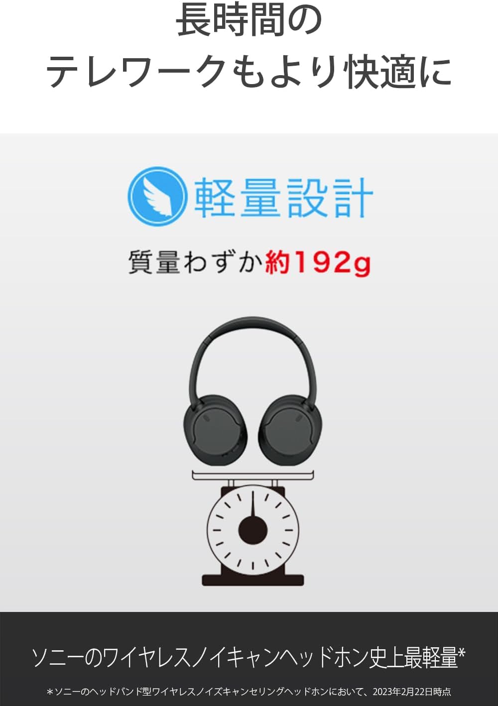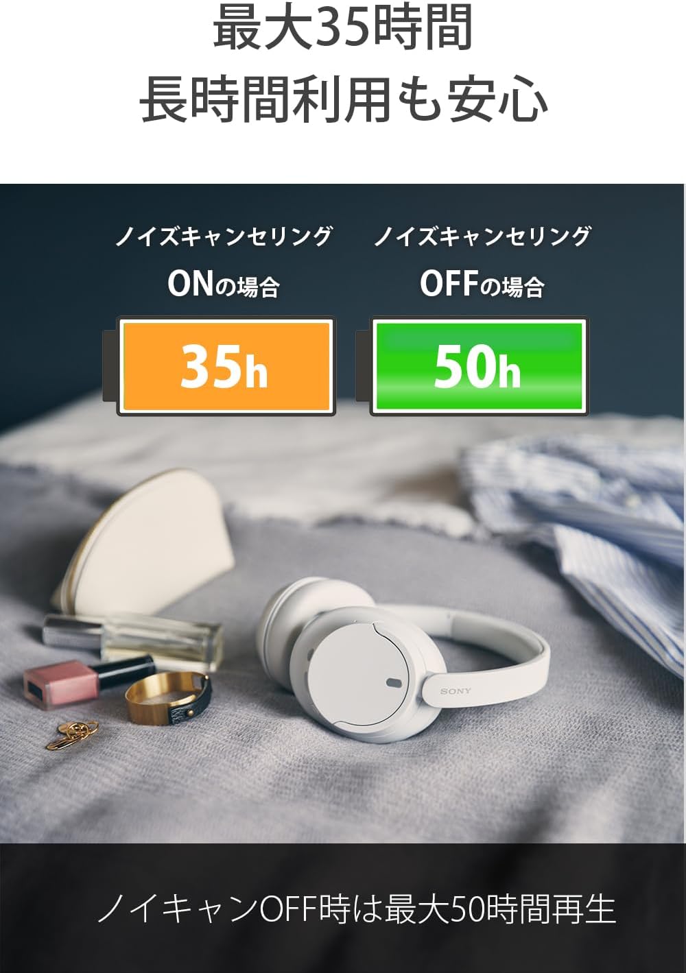 ノイズキャンセリングON時で最長35時間(*)、OFF時で最長50時間(*)音楽再生可能なロングバッテリーライフ
