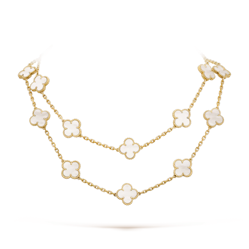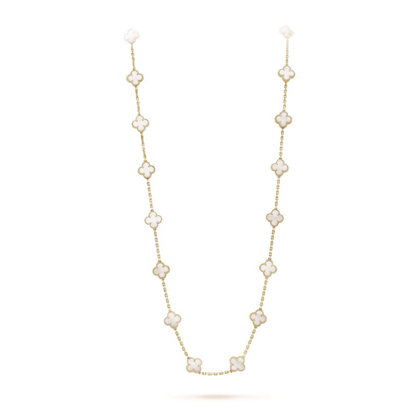 ヴィンテージ アルハンブラ ロングネックレス、20モチーフ、イエローゴールド、ホワイト マザーオブパール