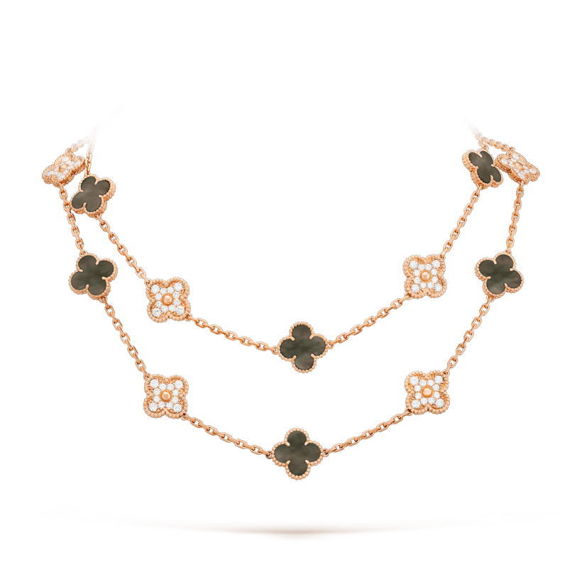 ヴィンテージ アルハンブラ ロングネックレス、20モチーフ、ローズ ゴールド、グレーマザーオブパール、ラウンドカット ダイヤモンド、ダイヤモンドのクオリティ DEF IF~VVS