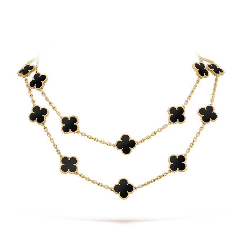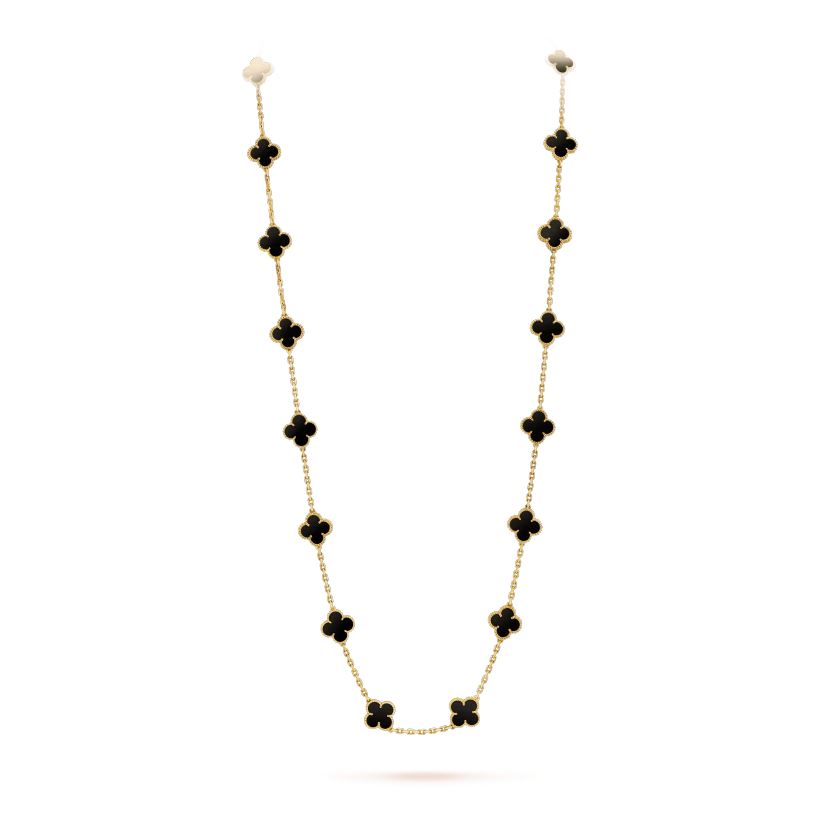 ヴィンテージ アルハンブラ ロングネックレス、20モチーフ、イエローゴールド、オニキス