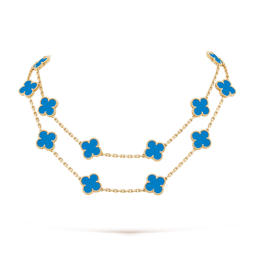 ヴィンテージ アルハンブラ ロングネックレス、20 モチーフ、イエローゴールド、ブルーアゲート。