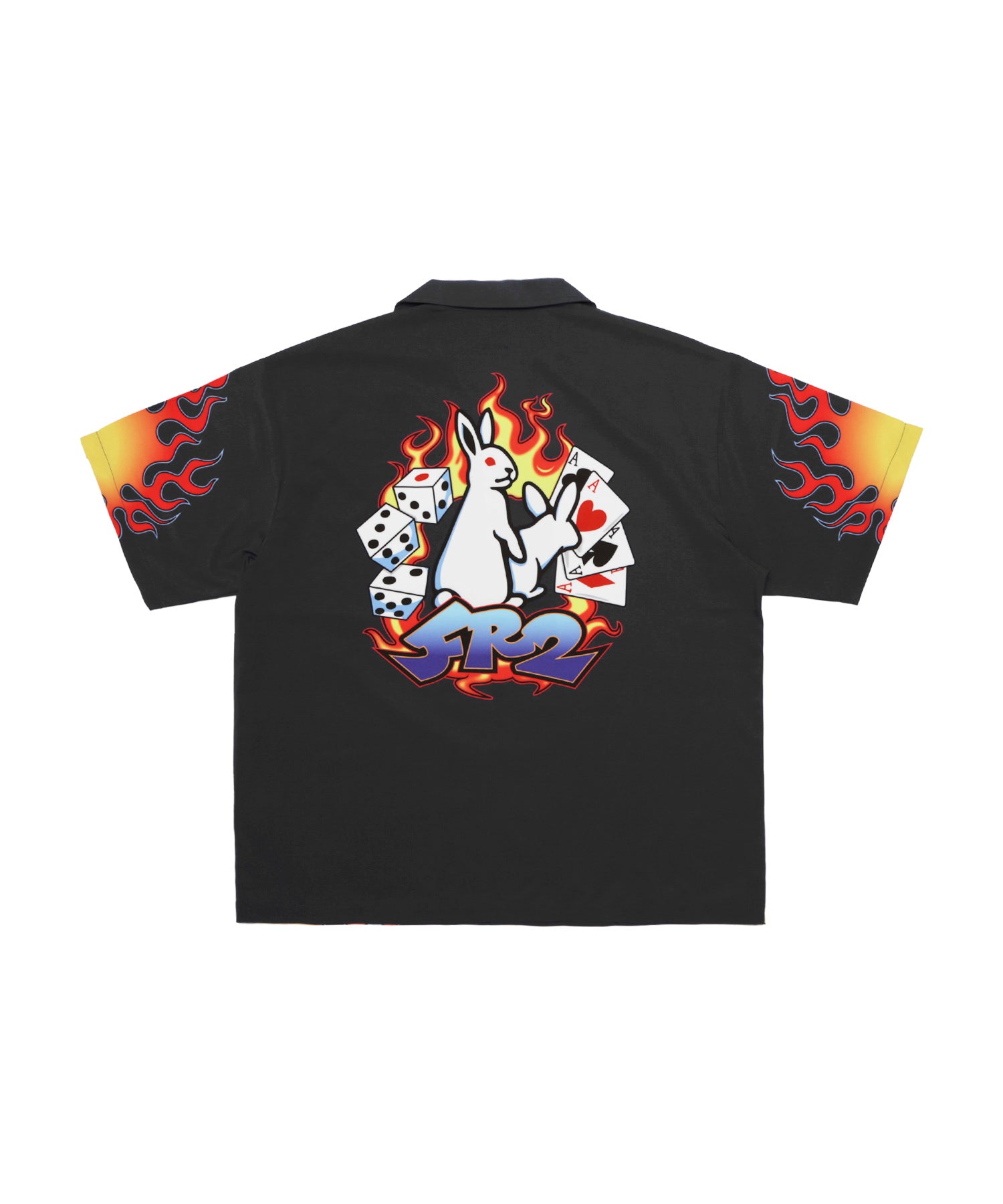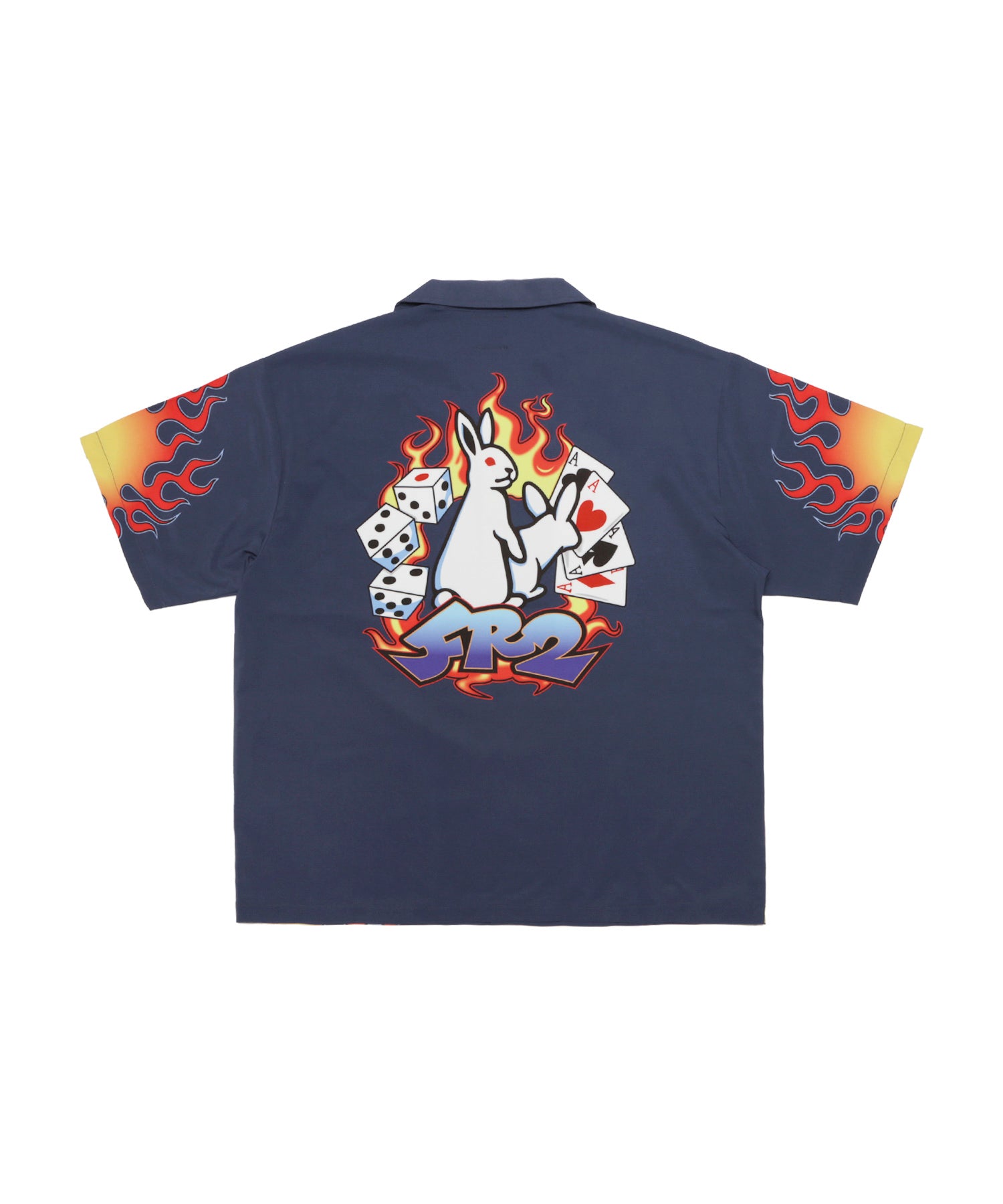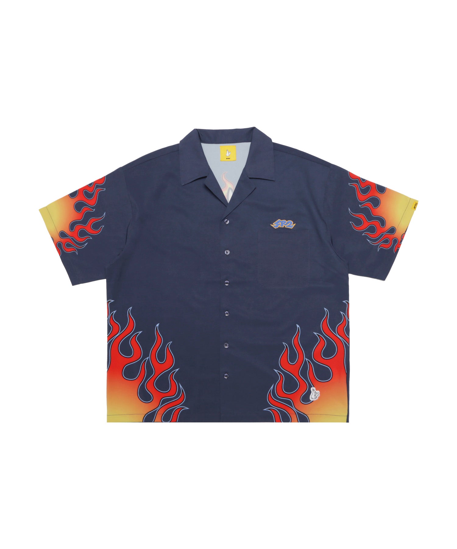 フロントは左胸にワンポイントでロゴを刺繍で入れつつ、バックにアイコンをベースに取り入れたデザインを大きめにオン。両袖や裾にもファイヤーパターンを取り入れることでより存在感をプラス。ネックはオープンカラー仕立てで、一枚で着てもフロントを開けて羽織りのようなスタイルでもコーディネートのメインで活躍出来る一枚です。型番:FRS034