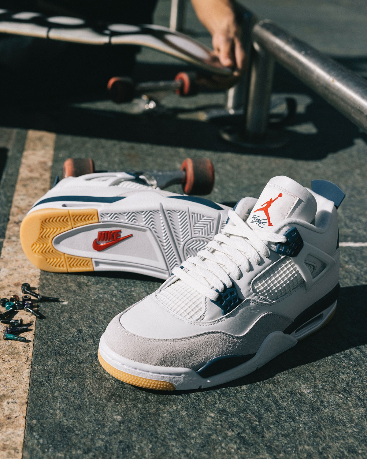 Nike SB x Air Jordan 4 Retro SP 'Navy' は、マイケル・ジョーダンの4作目のシグネチャーシューズをスケート仕様にリメイクした一足です。伝統的なシルエットに、ホワイトレザーのアッパー、グレーのスエード製フォアフットオーバーレイ、クォーターパネルのネットを組み合わせました。深紅のジャンプマンがウーブンタンタグを飾り、ネイビーのヒールタブにはNike SBのロゴがエンボス加工されています。成型アイレットとポリウレタンミッドソールにもネイビーのアクセントが加えられ、フォアフットの内蔵Airソールユニットは廃止されましたが、ヒールにはビジブルAirバッグが配置されています。足裏には、ヘリンボーントラクションアウトソールを採用し、摩耗しやすい部分にはガムラバーを採用しています。
