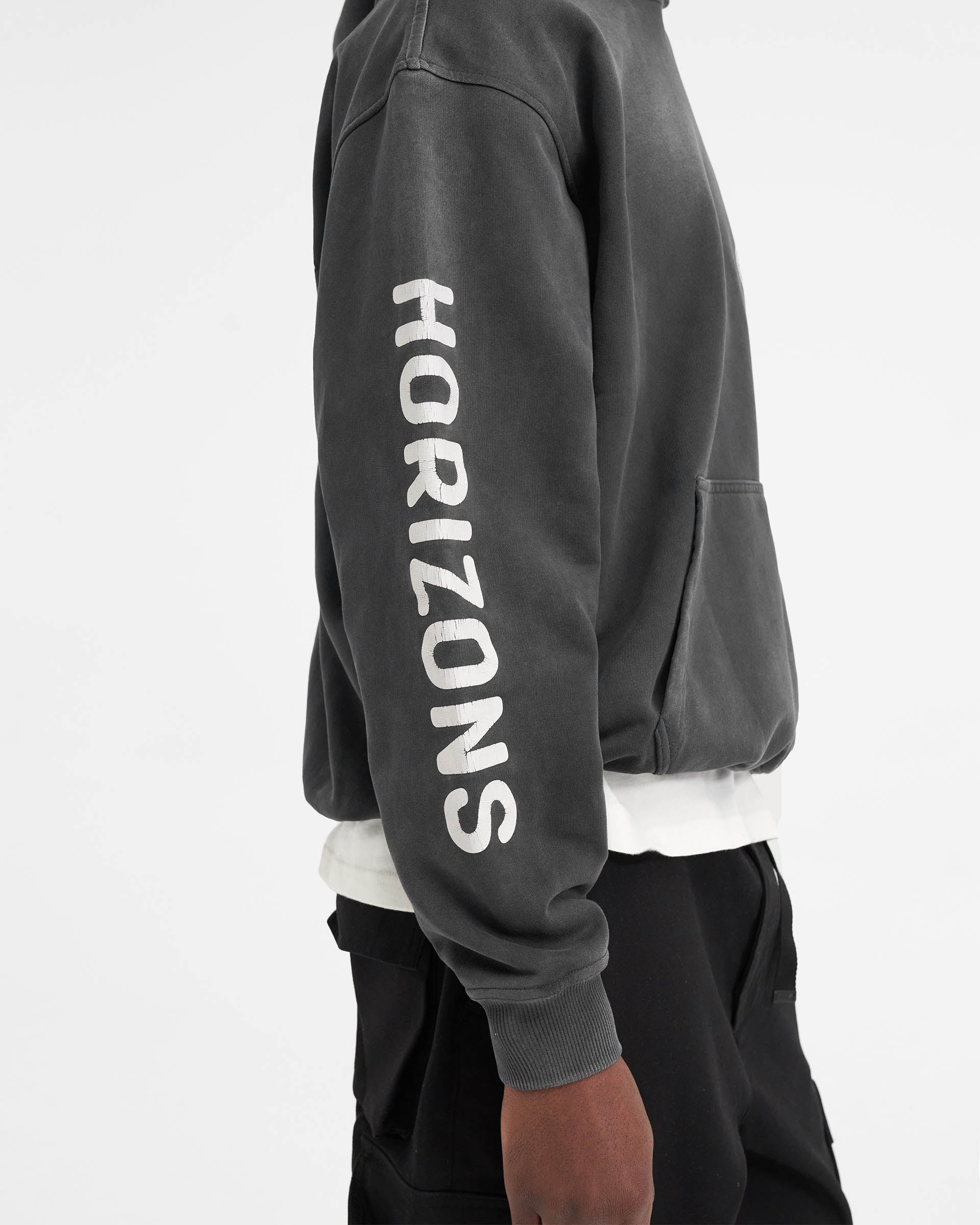 The Classic Parts Hoodie features our distressed Horizons motorsport inspired graphic to the front and back, with a cracked Horizons graphic to the right sleeve.