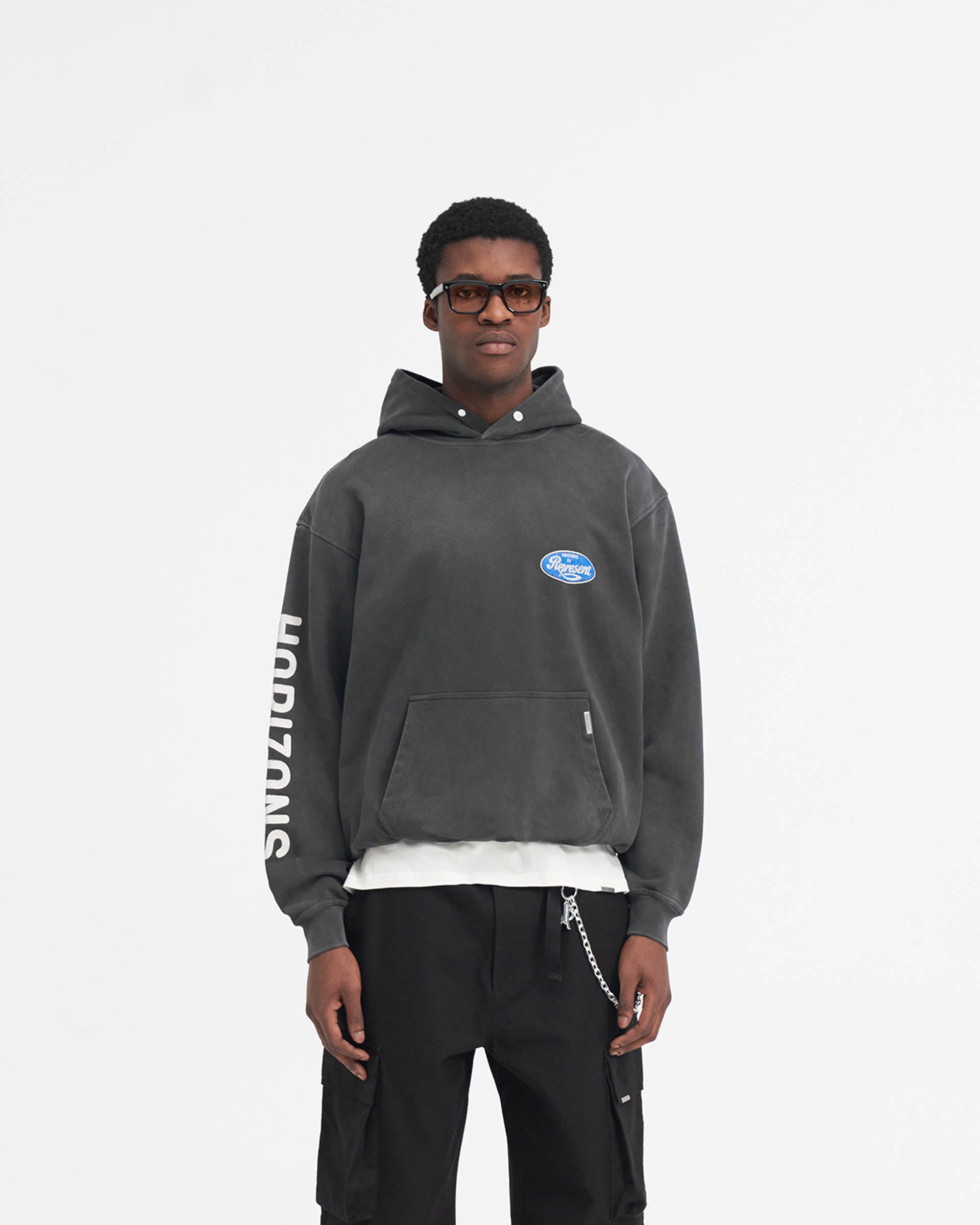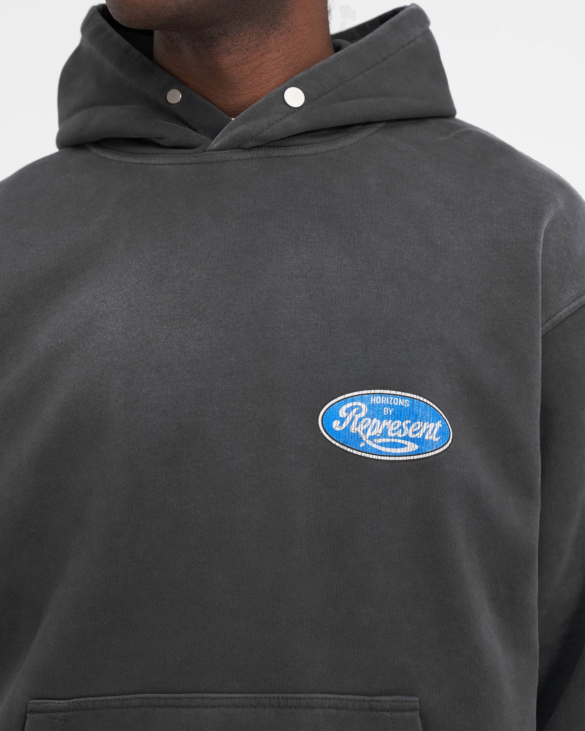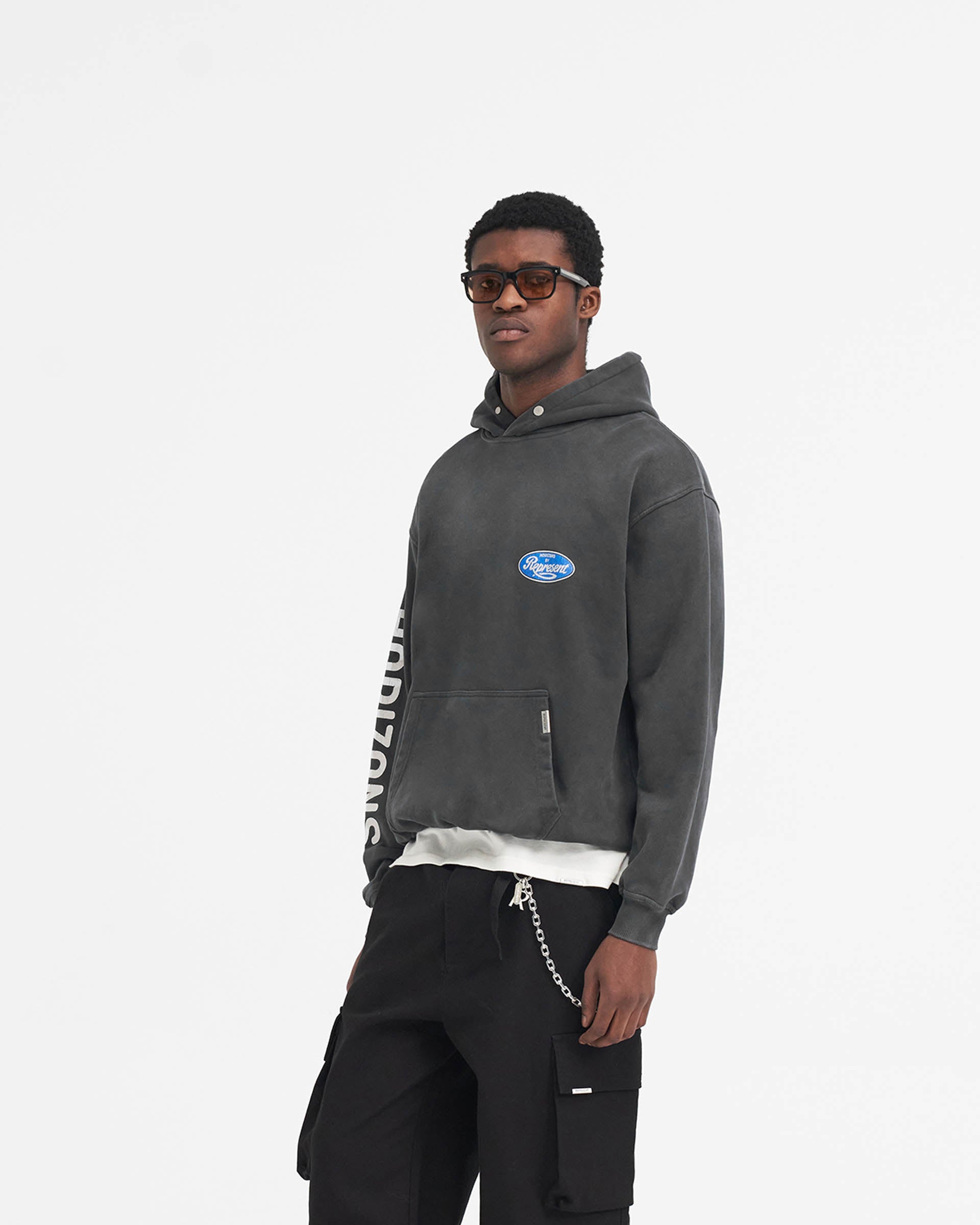 Introducing the Classic Parts Hoodie in Aged Black, a luxury hoodie crafted with an oversized fit. The hoodie has ribbed hem and cuffs and is finished with a Represent metal bar to the pocket and Cobrax popper to the hood.