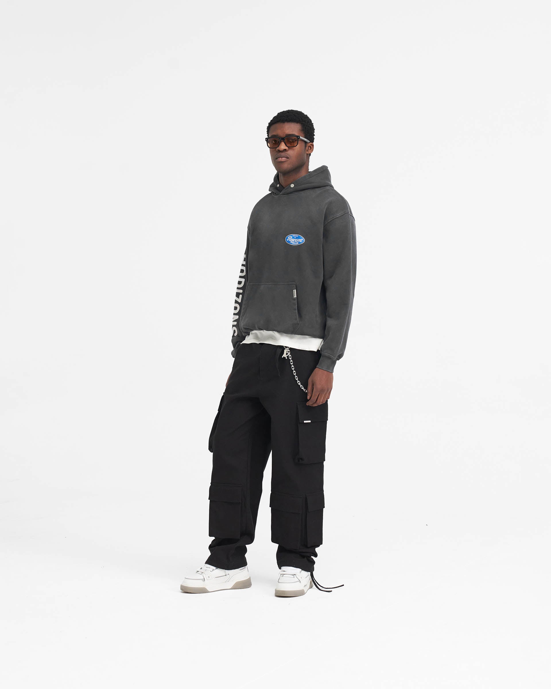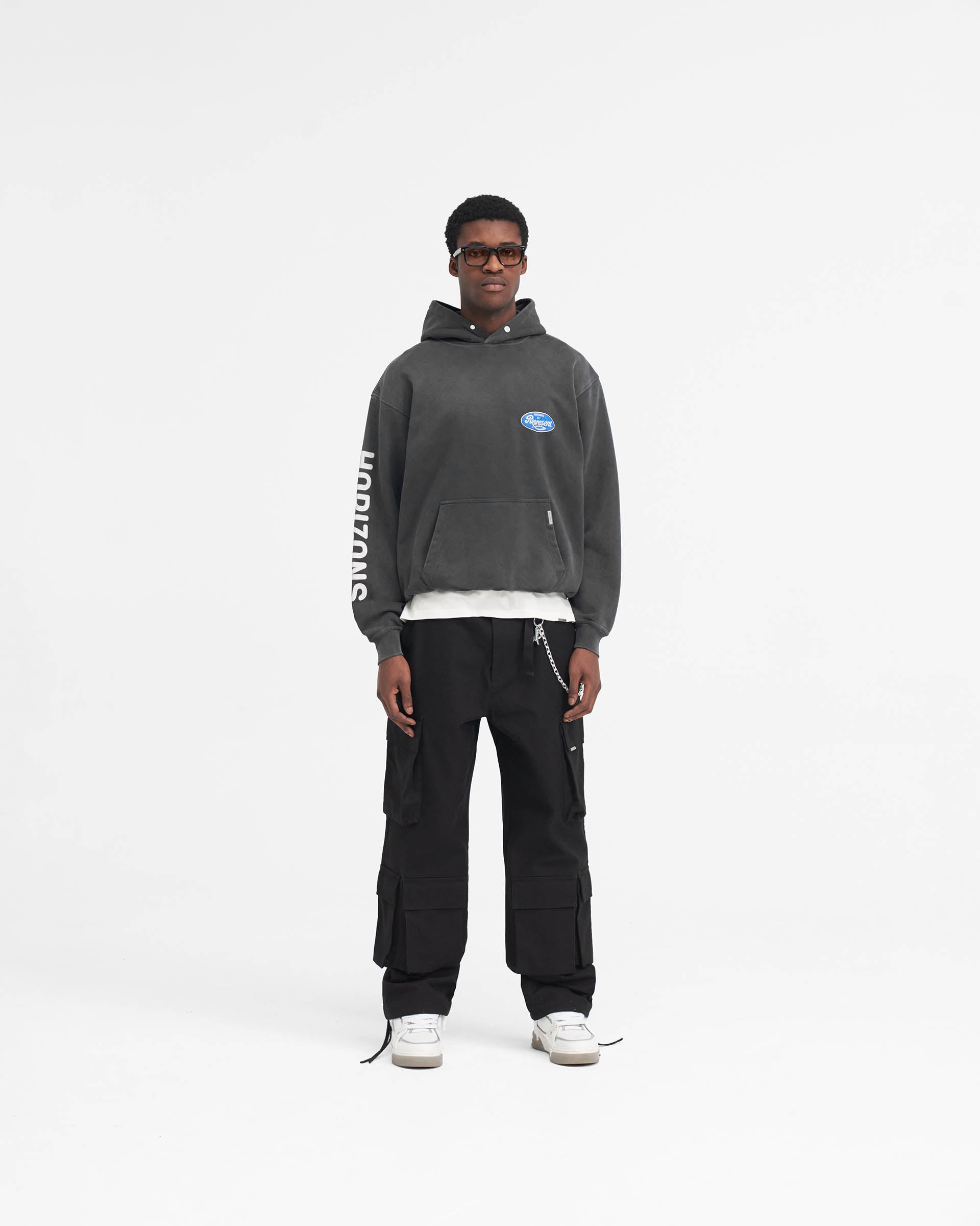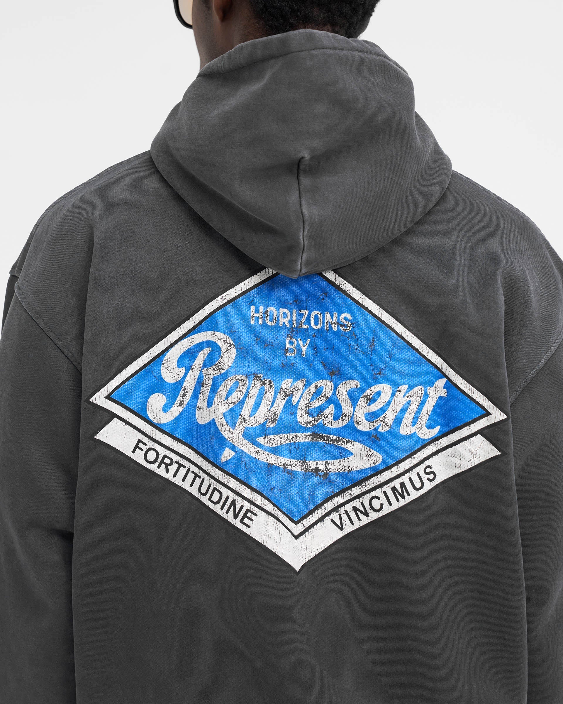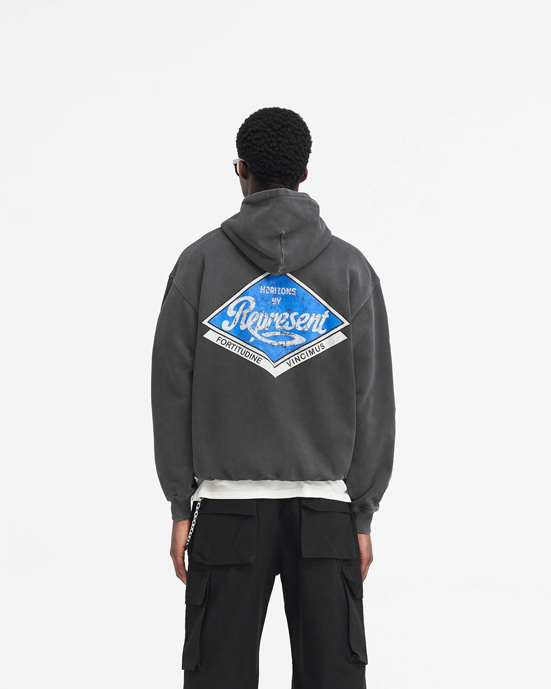 Introducing the Classic Parts Hoodie in Aged Black, a luxury hoodie crafted with an oversized fit. The hoodie has ribbed hem and cuffs and is finished with a Represent metal bar to the pocket and Cobrax popper to the hood.