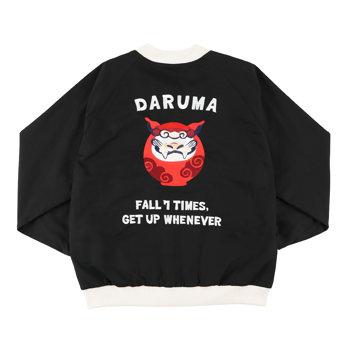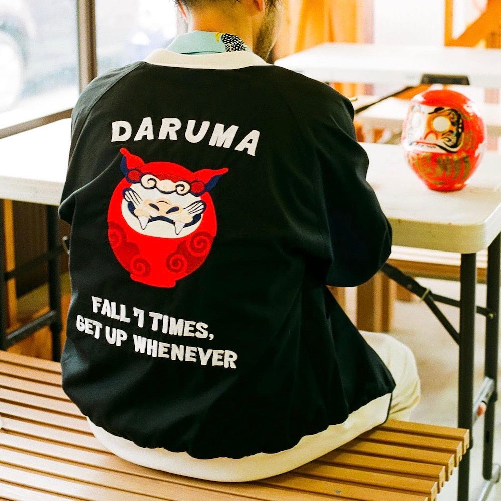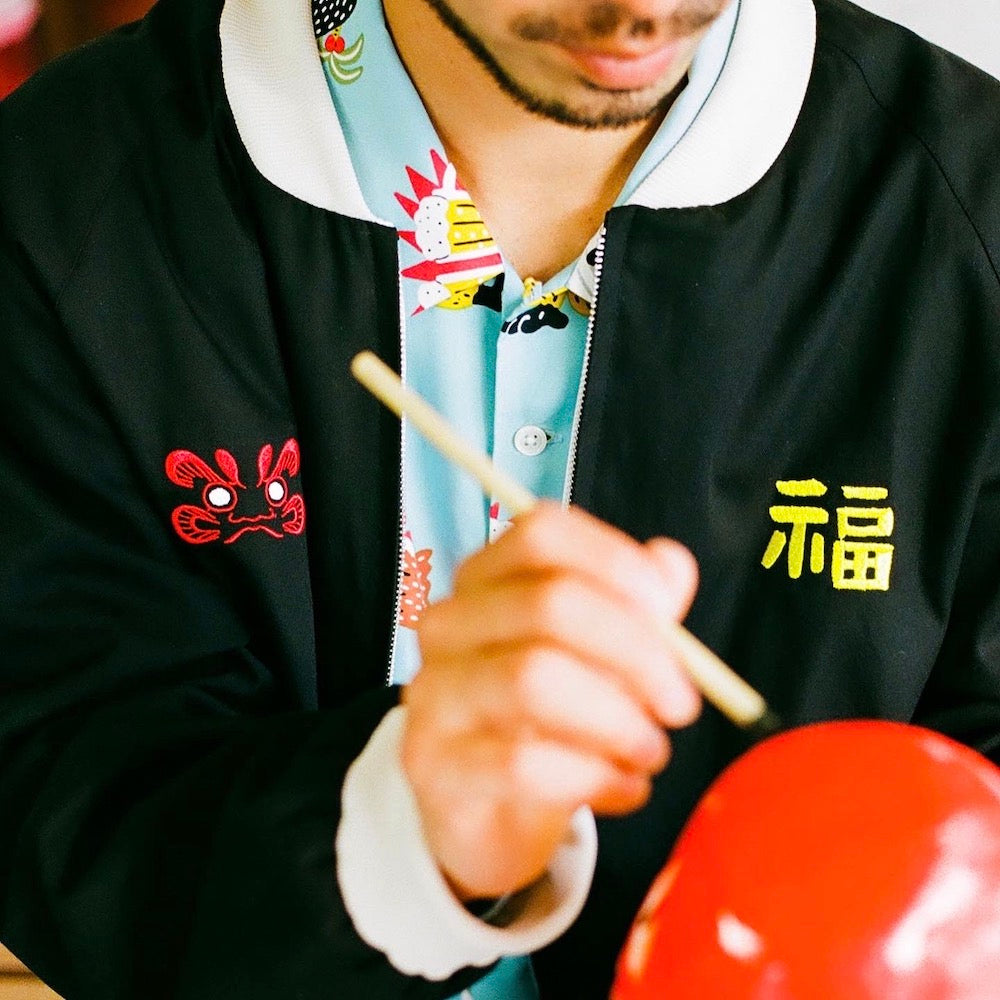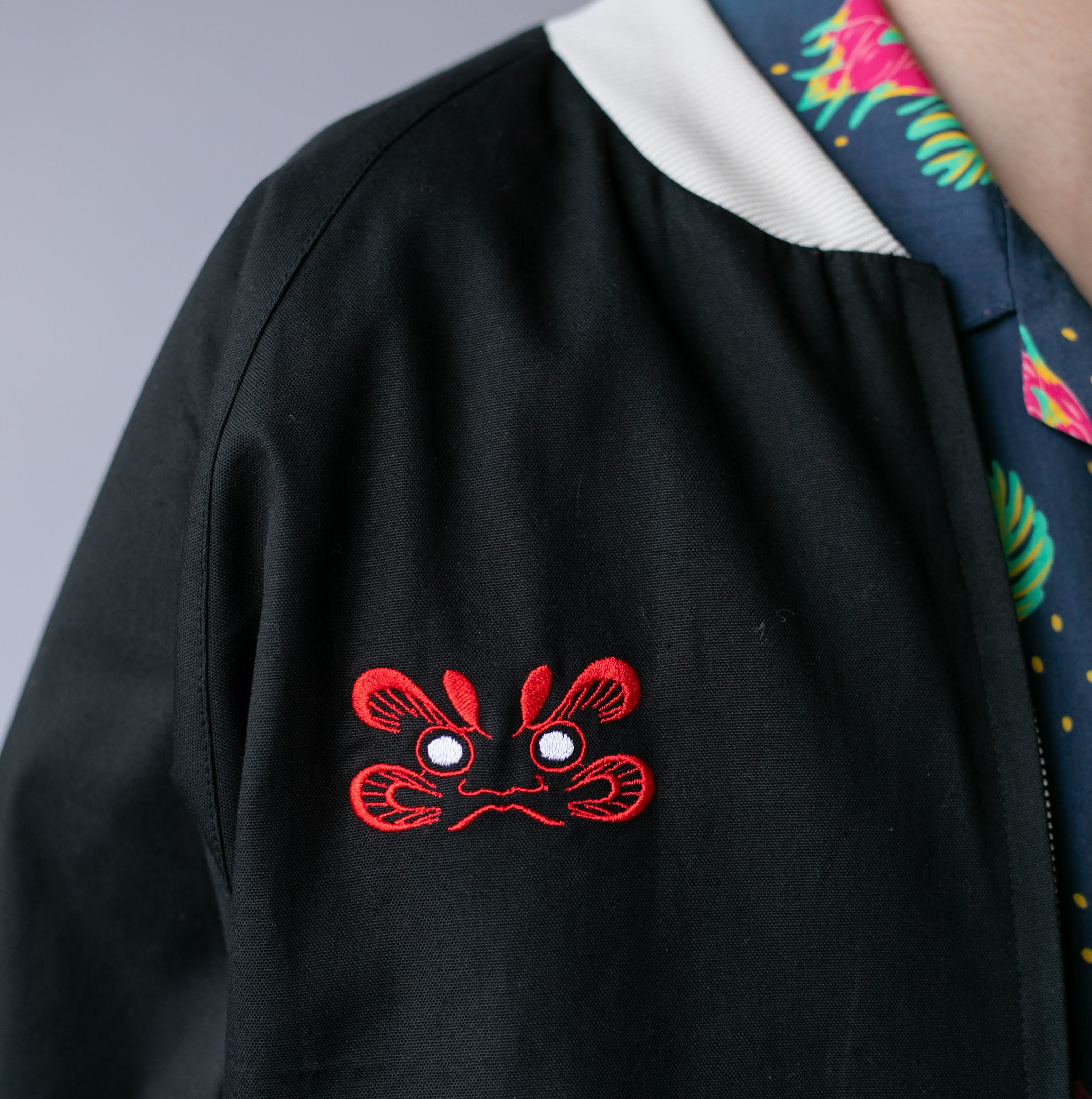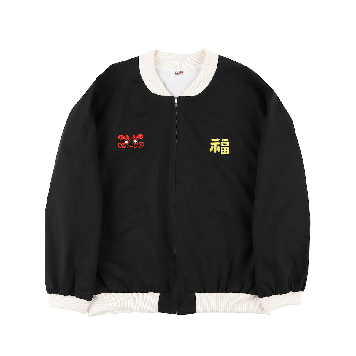 縁起物として古来より多くの人々に愛されるだるまにEanbeのルーツ沖縄の守り神「シーサー」をミックスしたイラストレーションを採用。着るだけで前向きに、そして運気まで上がりそうな刺繍が特徴となるベトナムジャケットです。