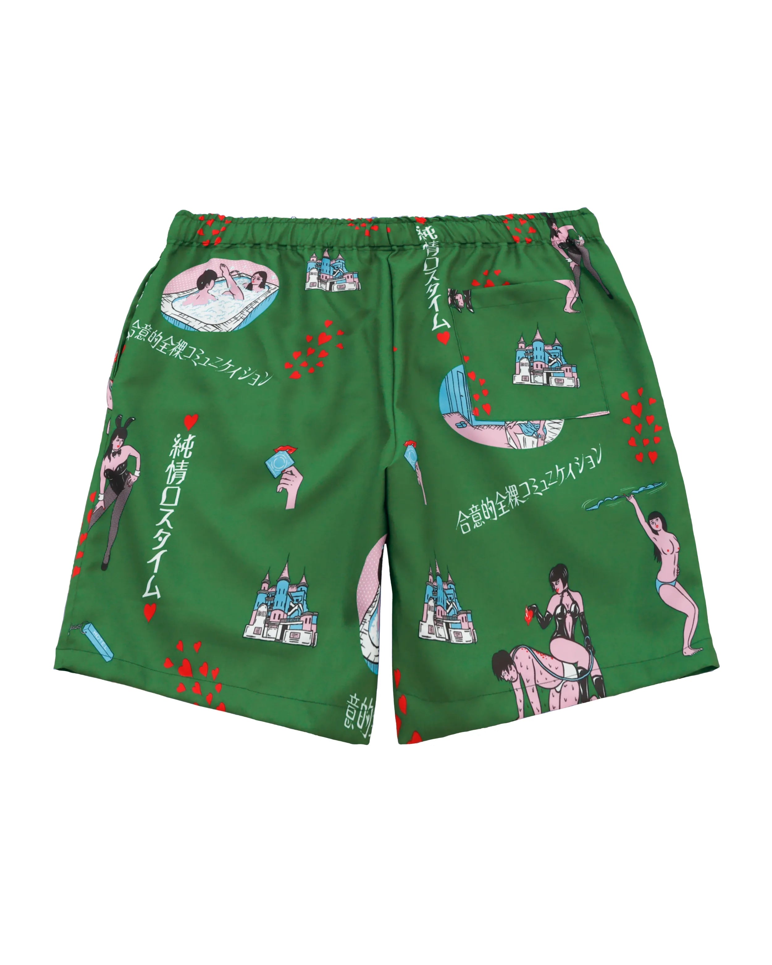 「ラブホテル」をテーマに、インターチェンジ付近にありそうな架空のレトロなラブホ内でのシーンイラストを散りばめた総柄&ボーダーパターンのアロハシャツ「純情ロスタイム」のデザインを使用したショートパンツ。新色のグリーンで登場。