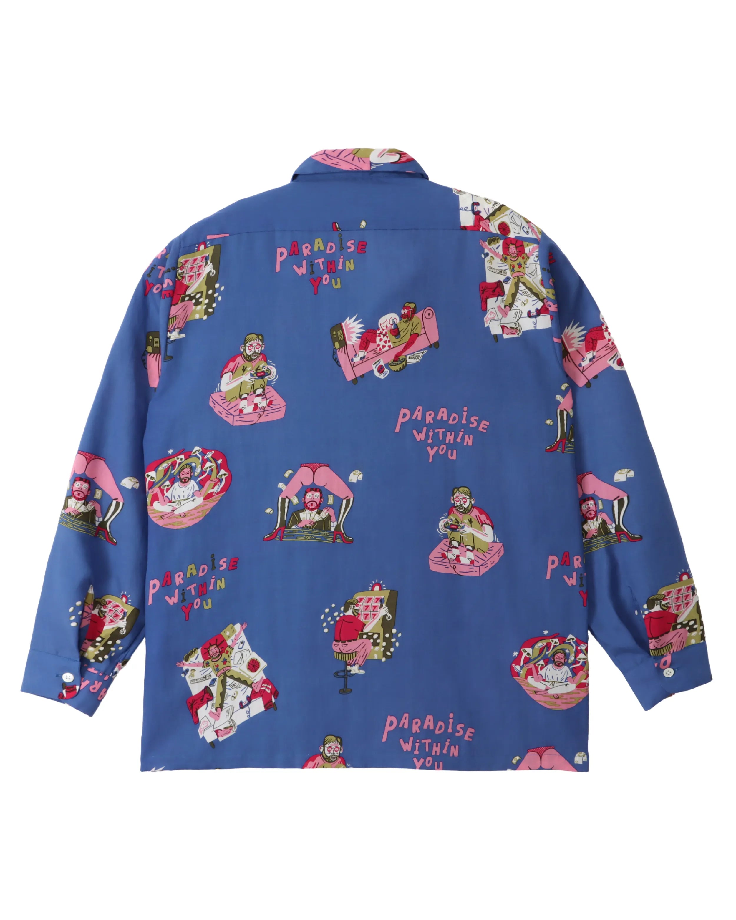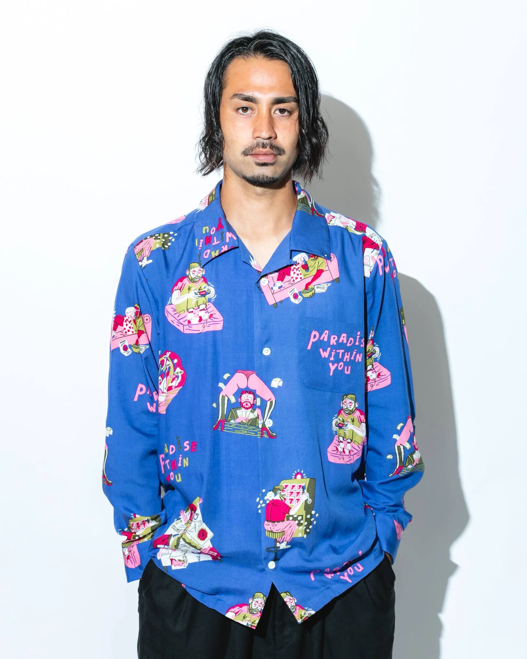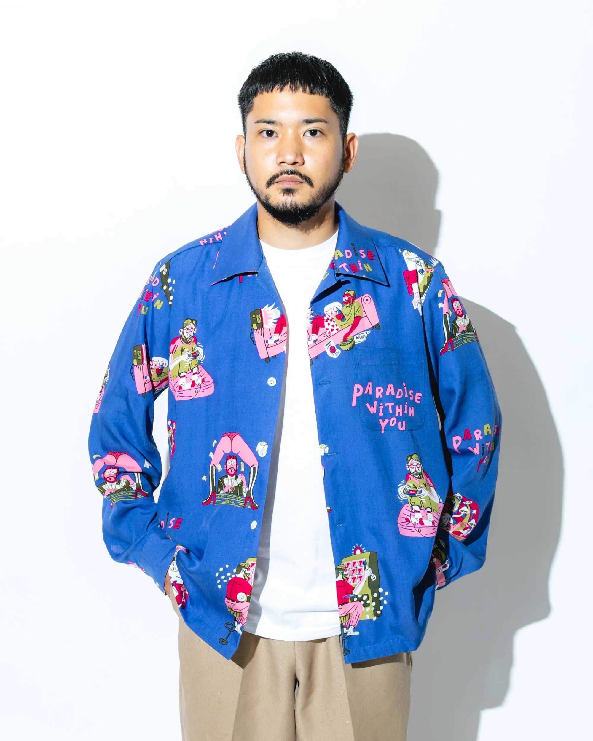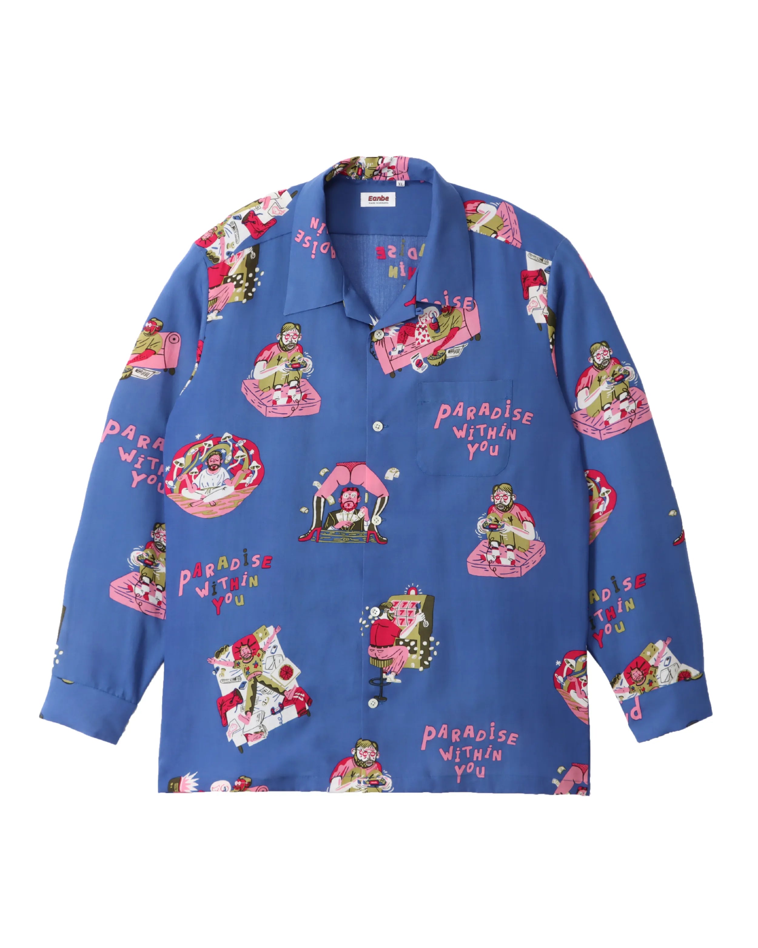 「楽園」をテーマに、思い思いのひとときに熱中するおっさんがプリントされた総柄のアロハシャツ『PARADISE』のロングスリーブ。アートワークを担当したのはオランダ人アーティストAart-jan Venema氏。
