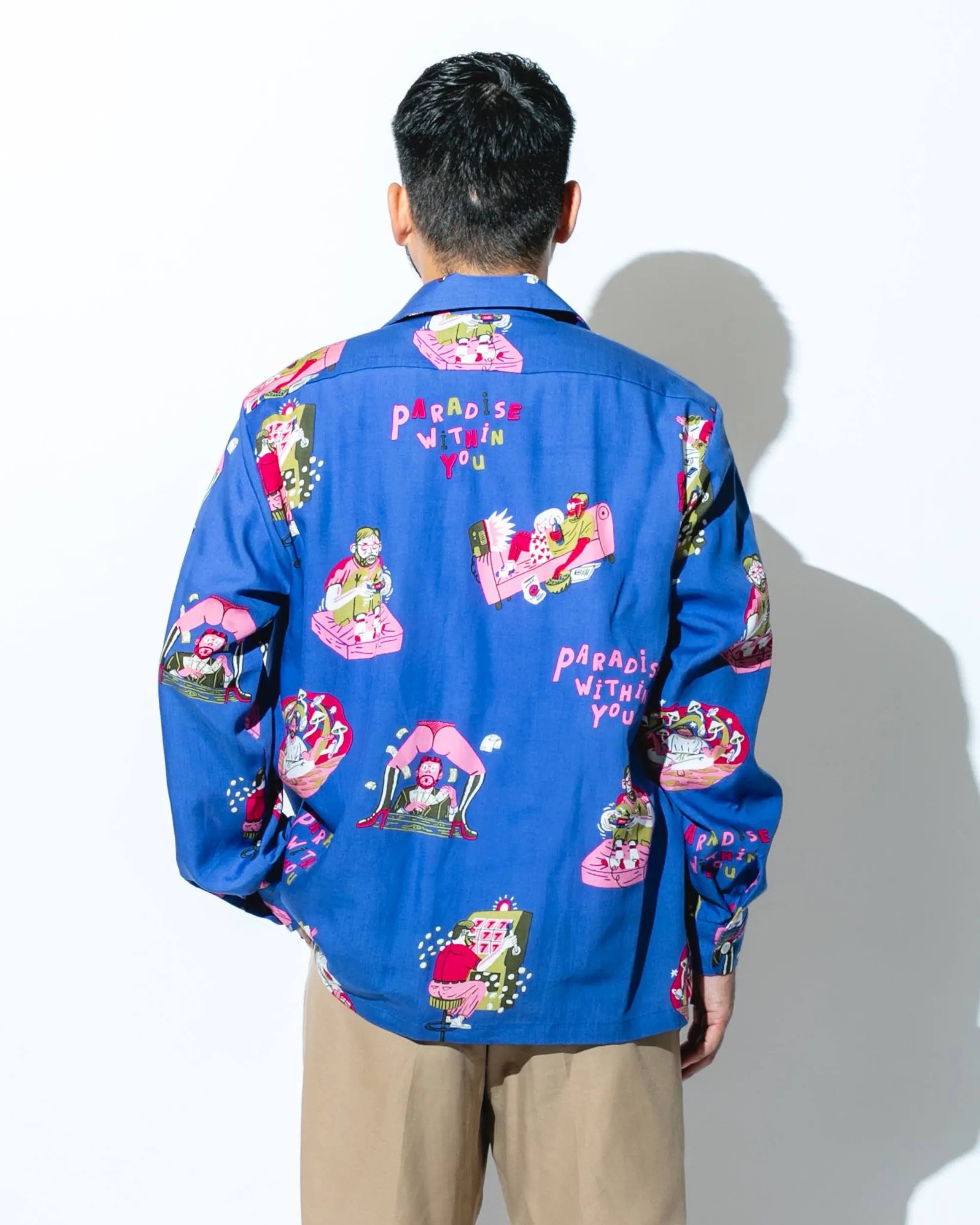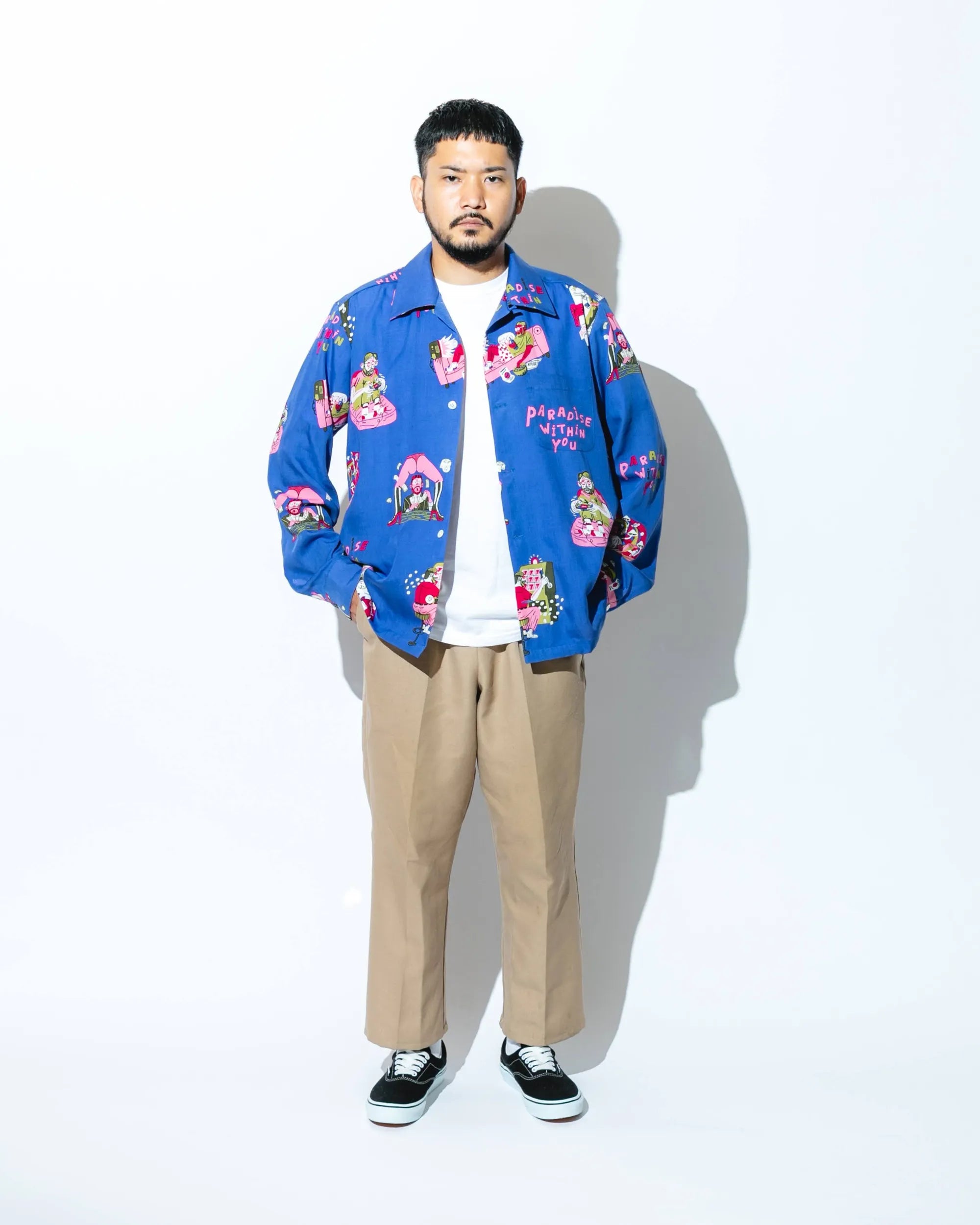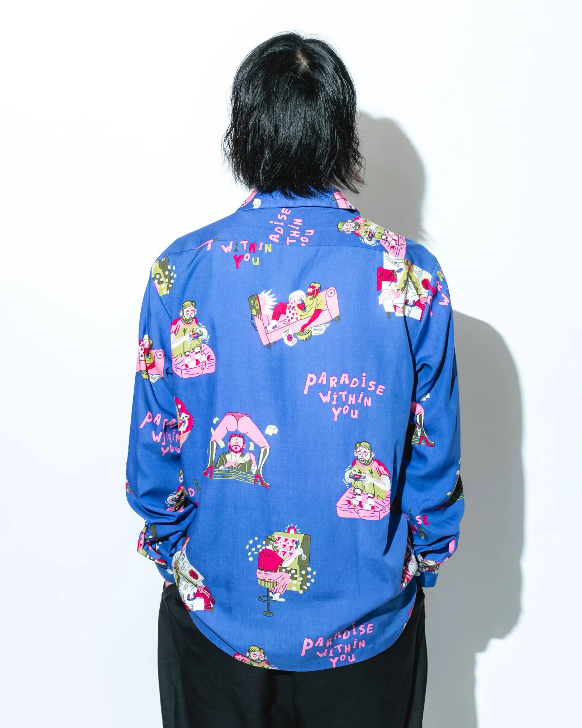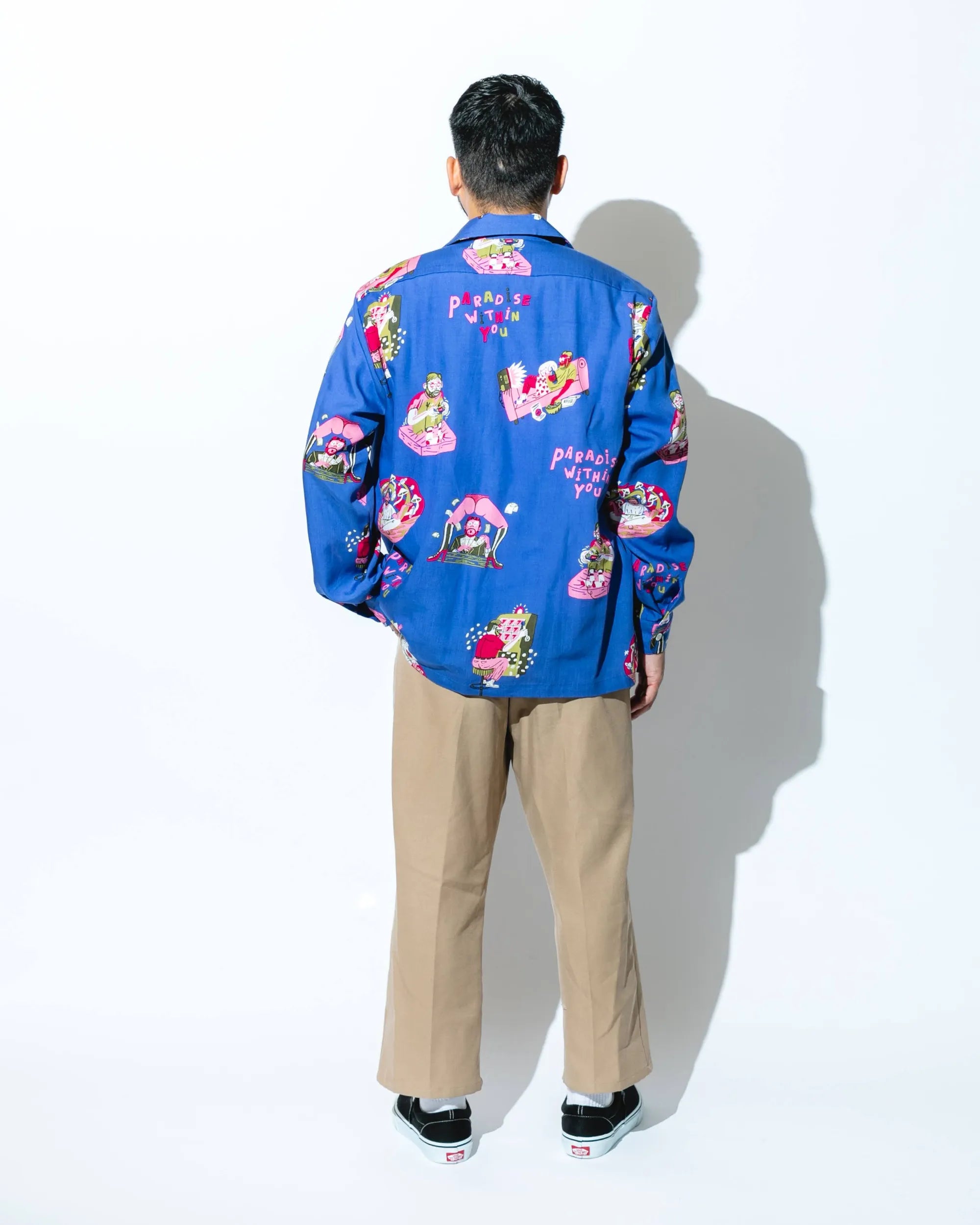 「楽園」をテーマに、思い思いのひとときに熱中するおっさんがプリントされた総柄のアロハシャツ『PARADISE』のロングスリーブ。アートワークを担当したのはオランダ人アーティストAart-jan Venema氏。