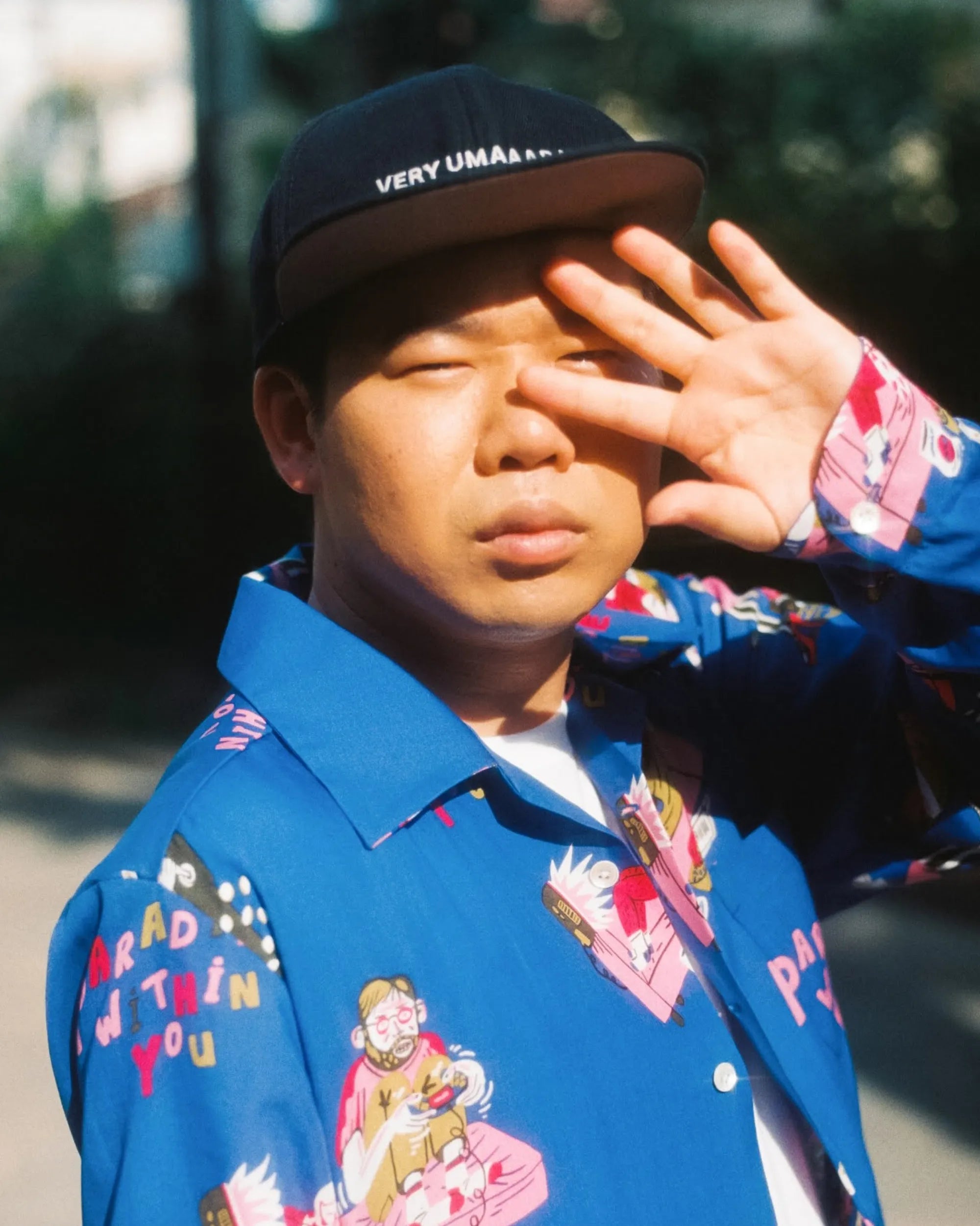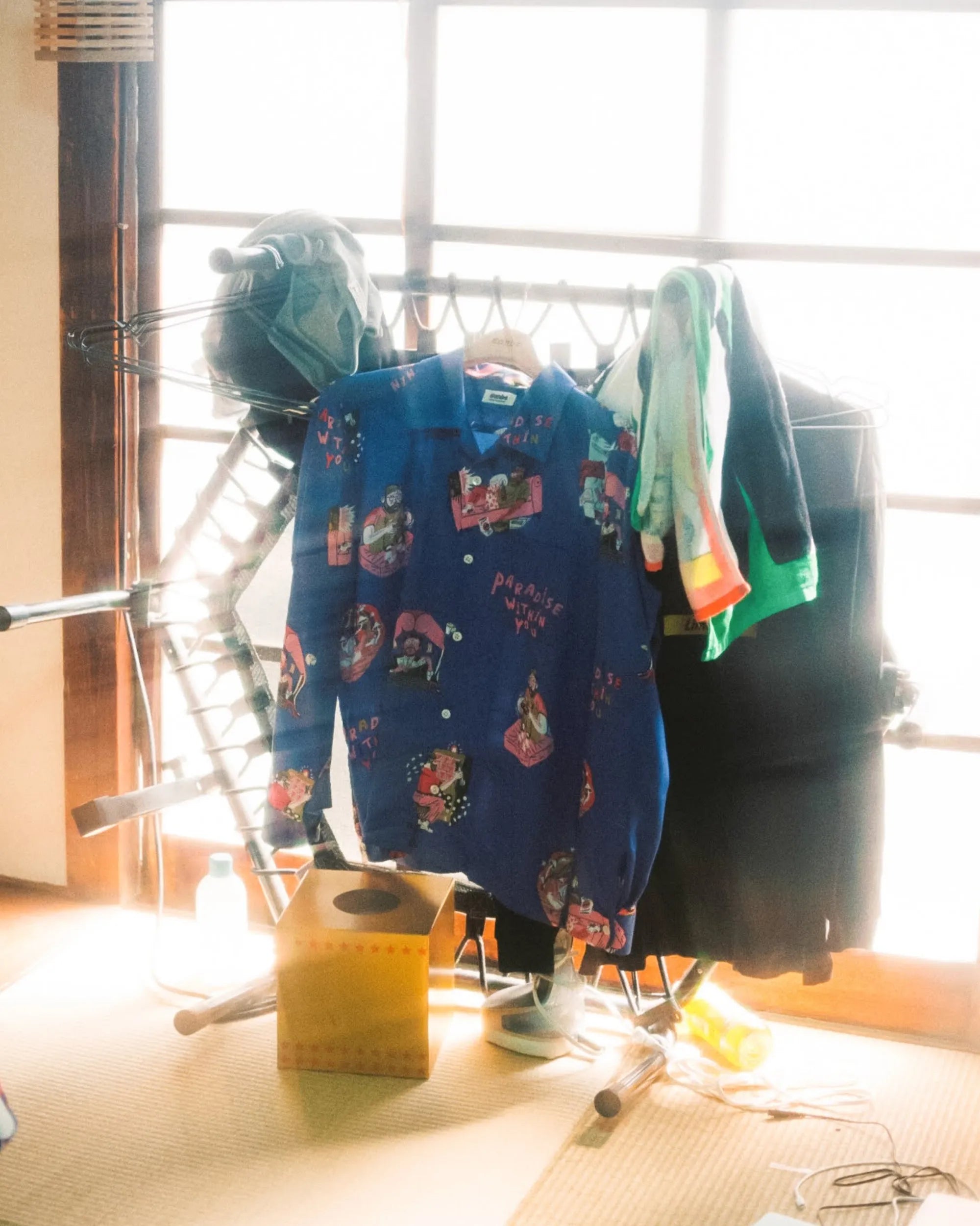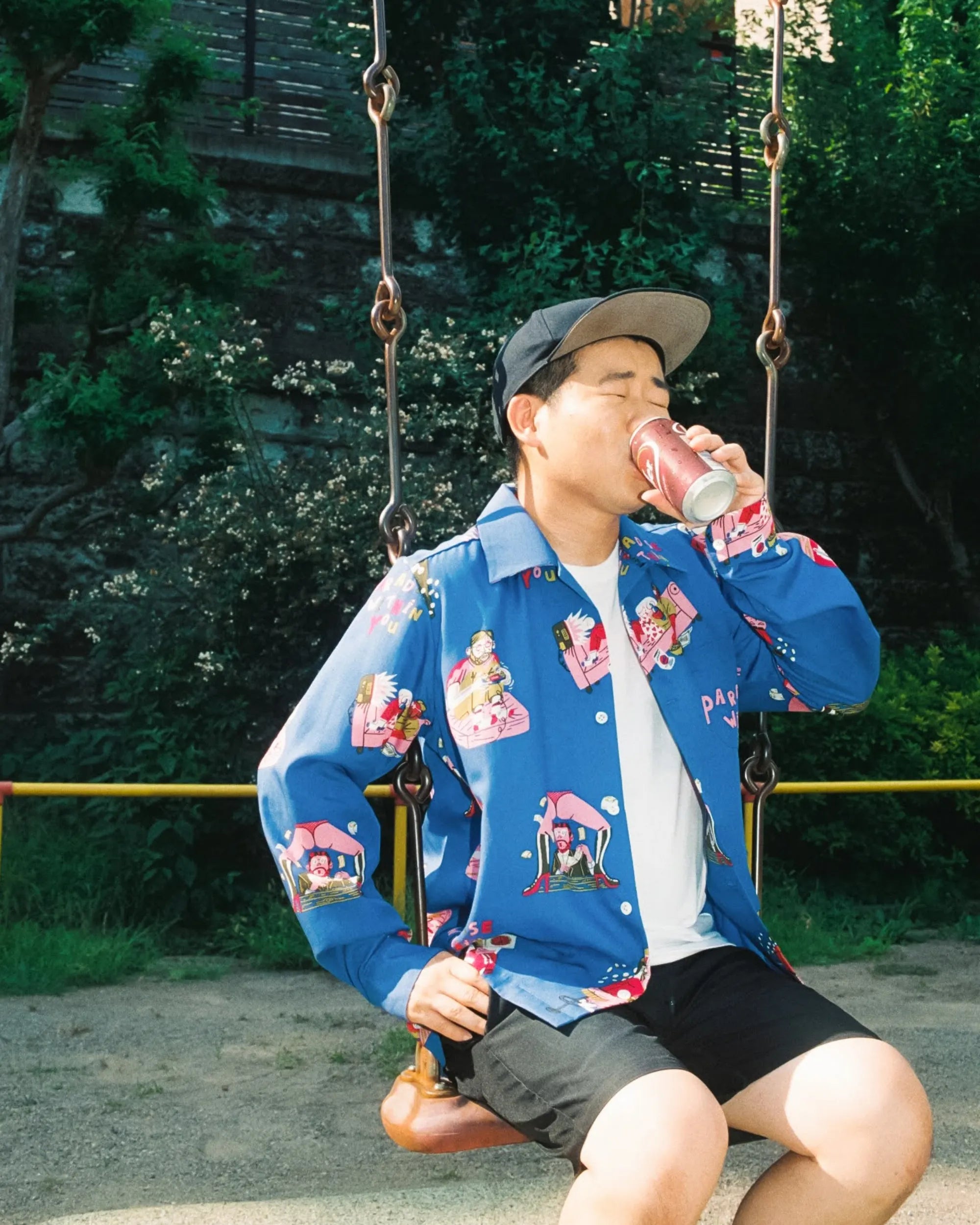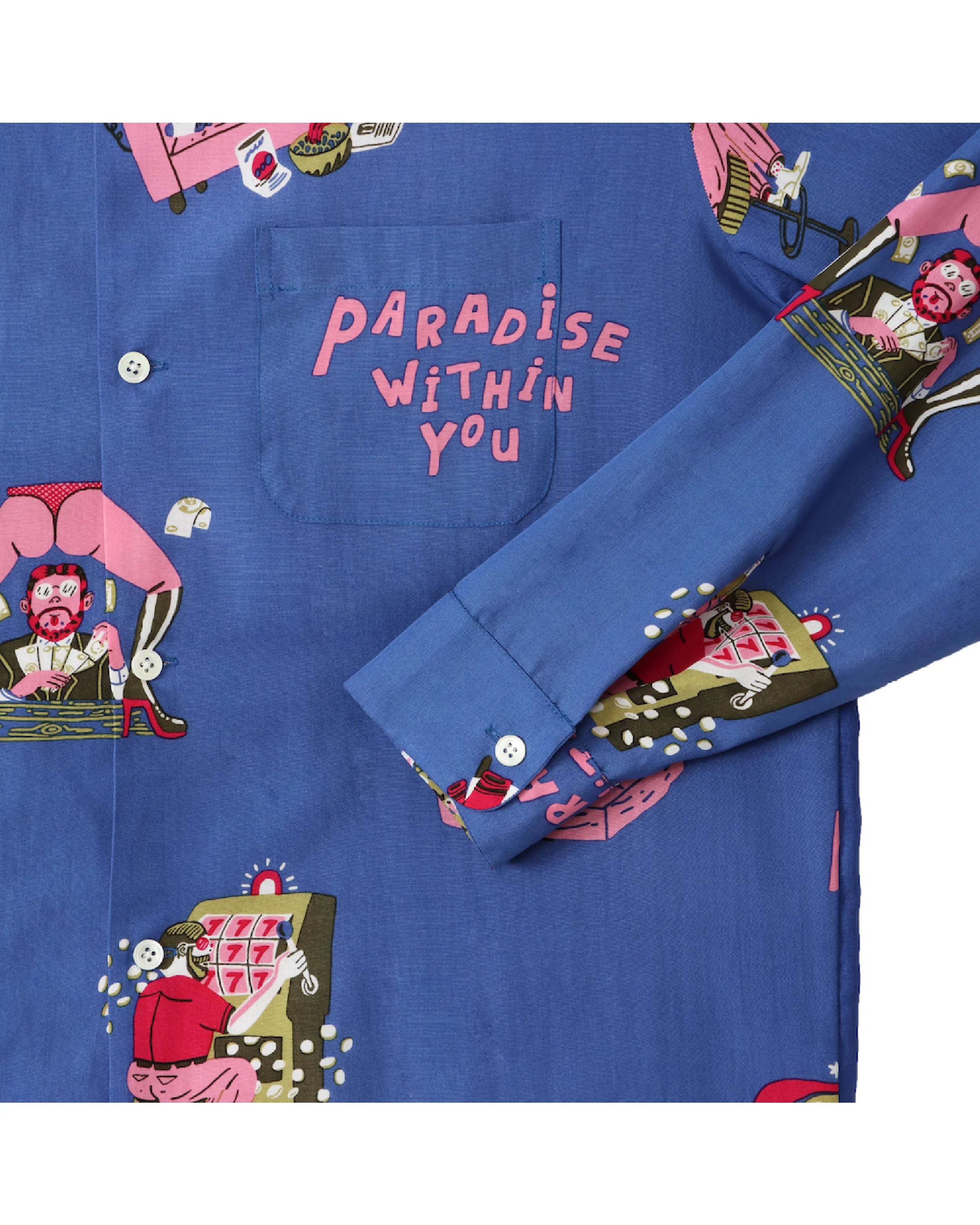 「楽園」をテーマに、思い思いのひとときに熱中するおっさんがプリントされた総柄のアロハシャツ『PARADISE』のロングスリーブ。アートワークを担当したのはオランダ人アーティストAart-jan Venema氏。