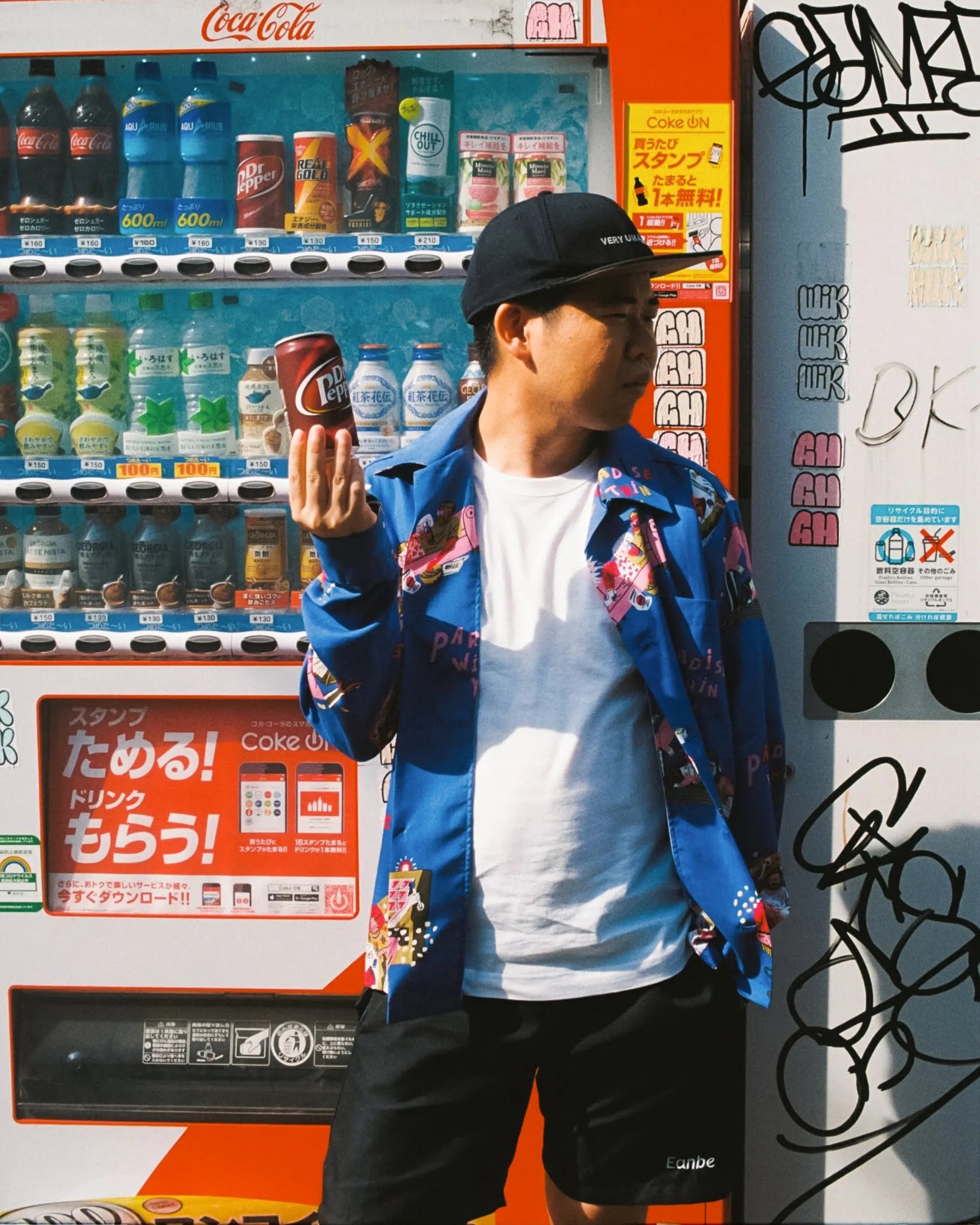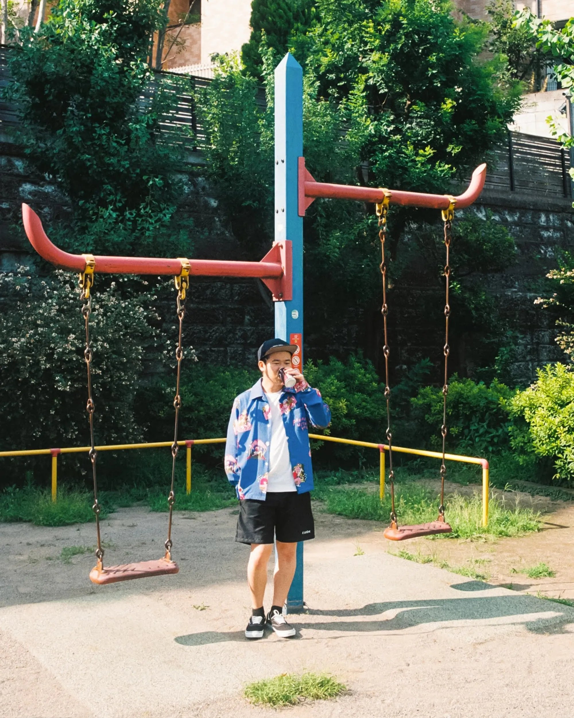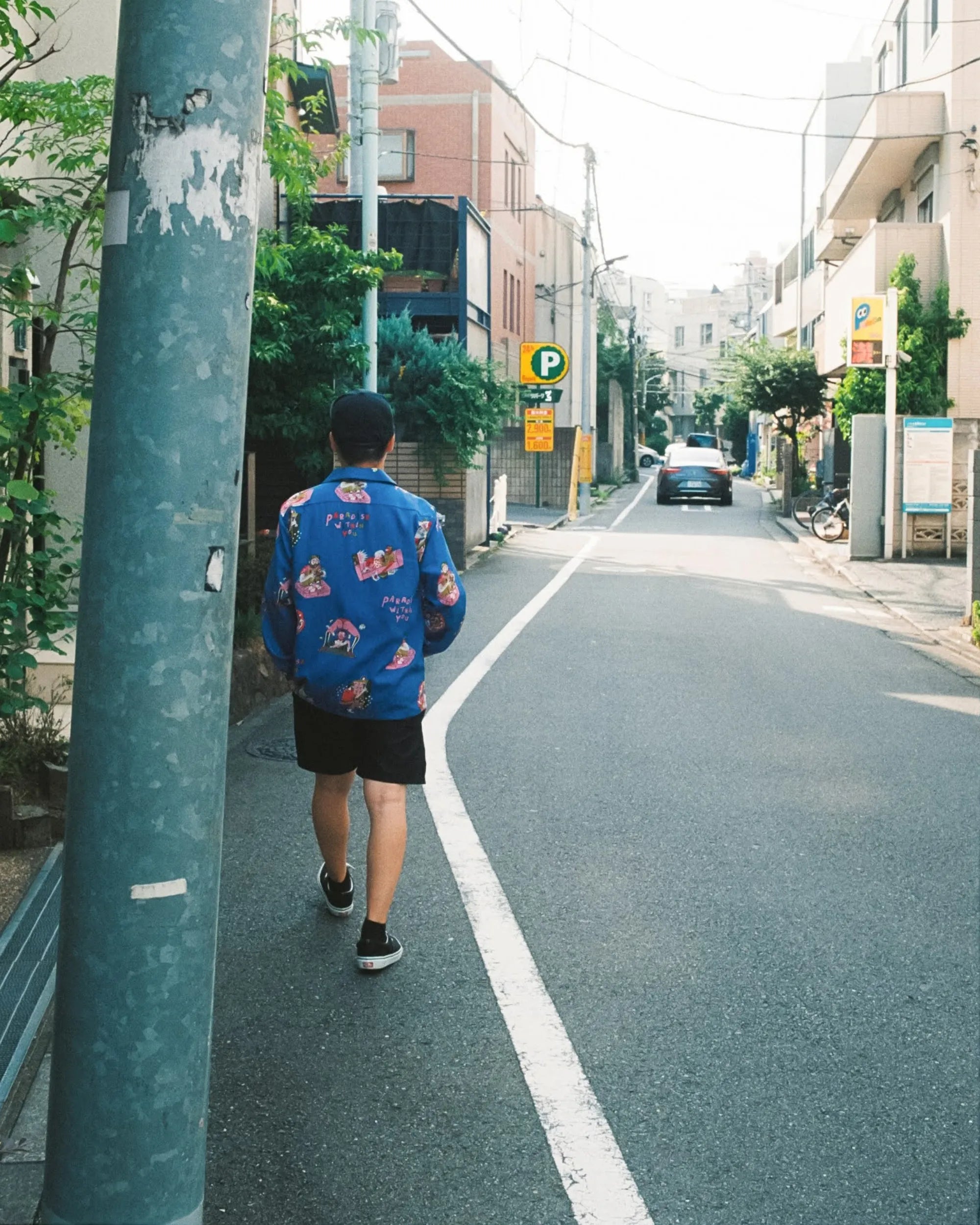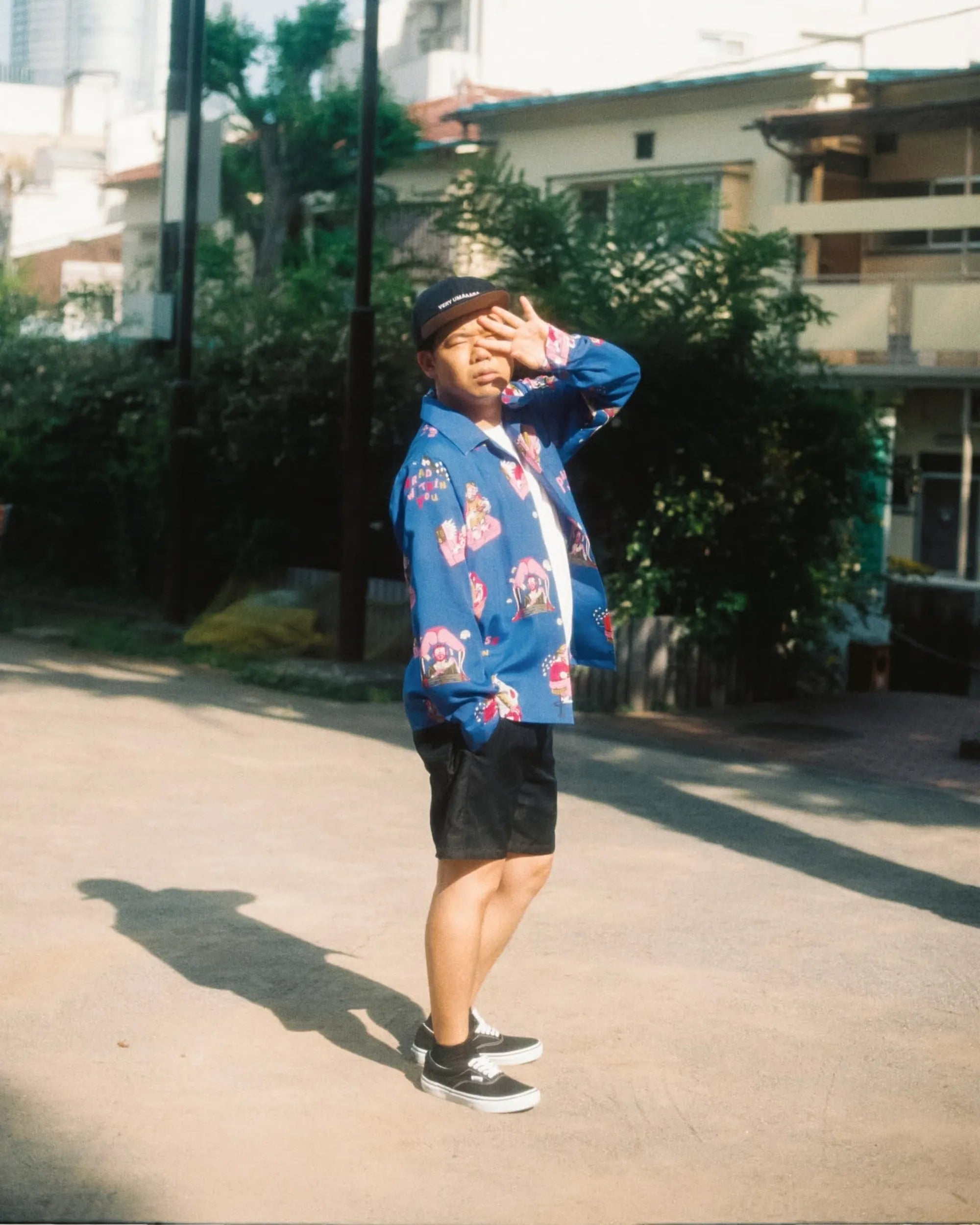 上品なブルーにカラフルなイラストが映えるこのシャツは、ショーパンやチノと合わせたリラックス感あるスタイルで。