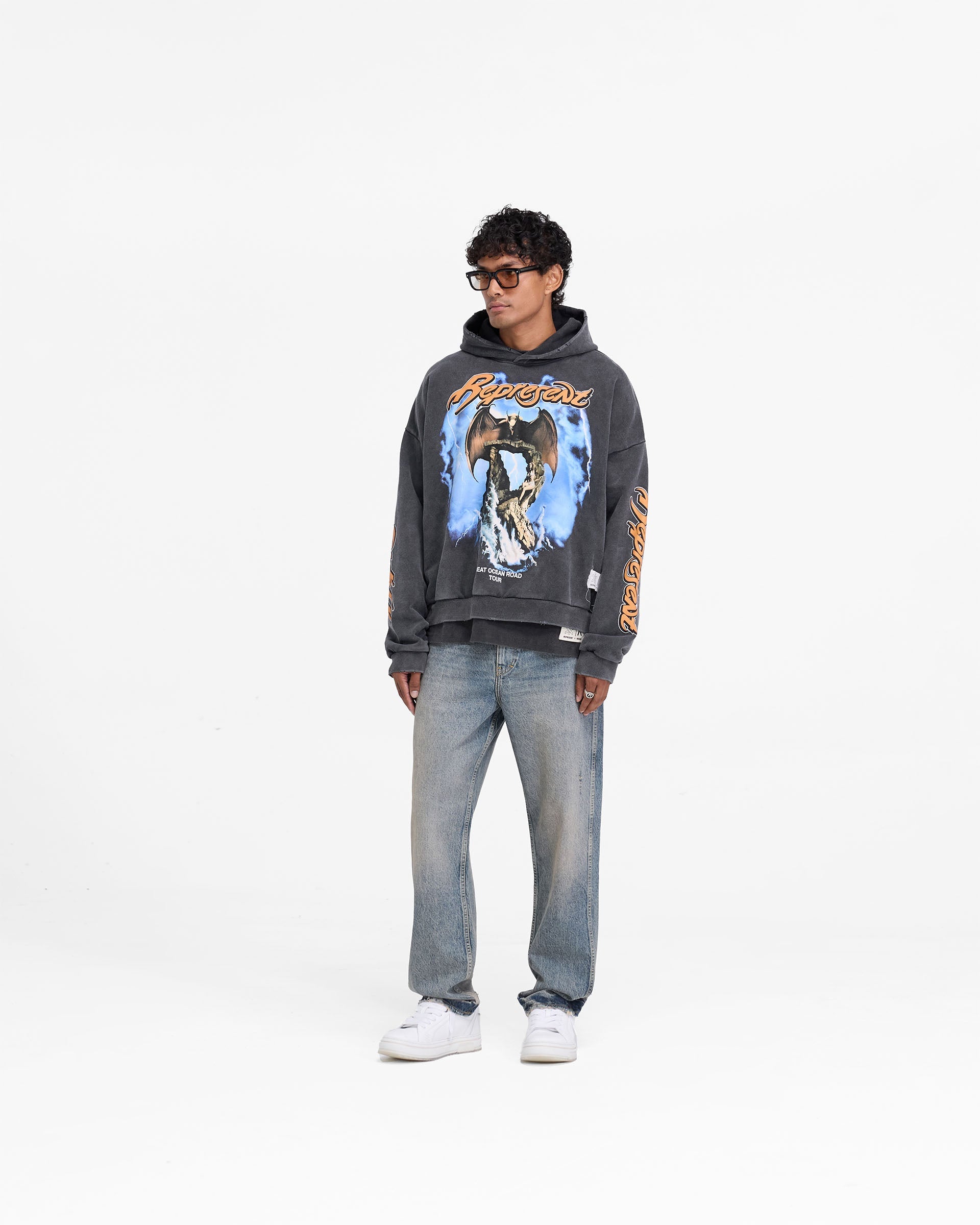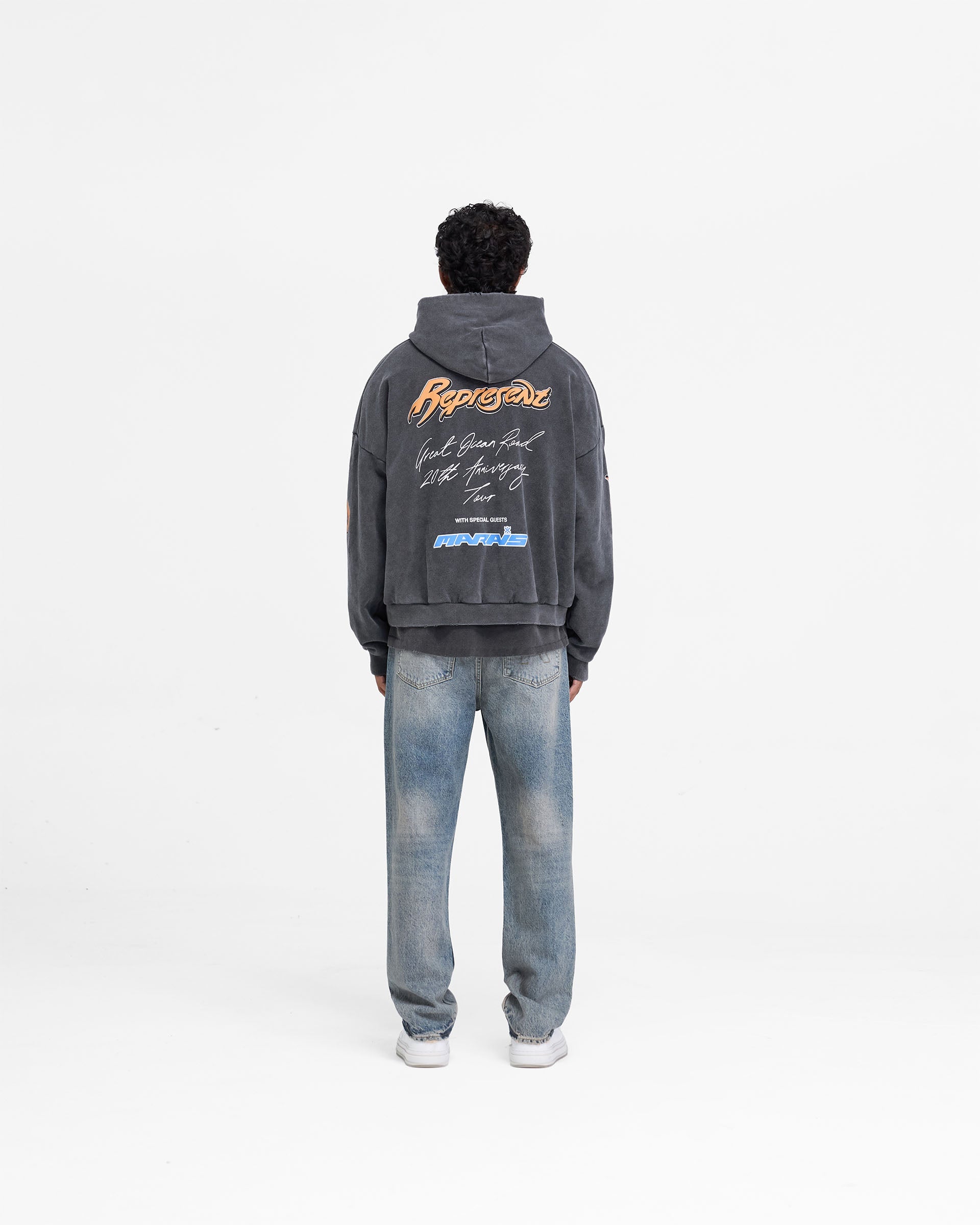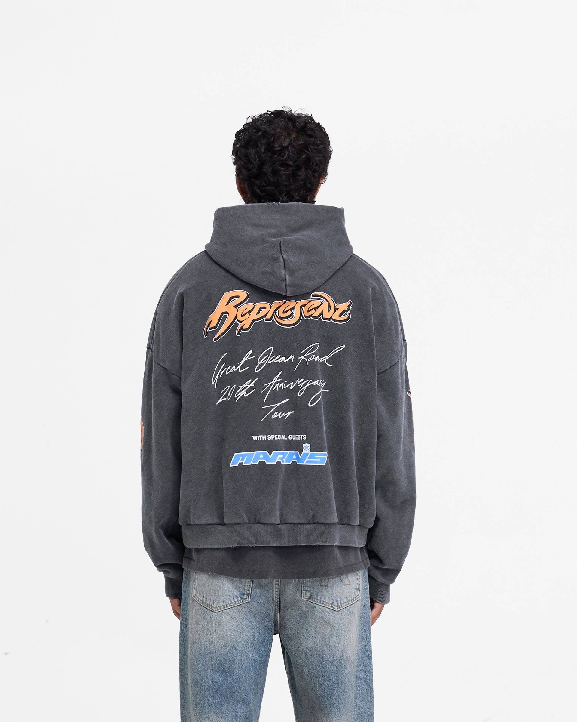 Introducing the Represent x Marais Great Ocean Hoodie in Vintage Grey, an oversized boxy hoodie crafted from heavy weight jersey cotton. The hoodie has a screen print graphic to the front, back and arms, and is finished with nibbling distressed details to the hood edge, cuffs and hem, and a woven branding label to the hem.