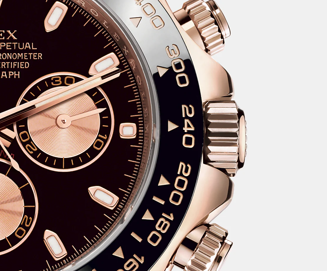 デイトナ クロノグラフの機能は、使用しない間にはリューズのようにねじ込まれ、100mまでの防水性能を確保するプッシャーにより作動する。クロノグラフ機能のスタート、ストップ、リセットを押すと、最新テクノロジーが可能にした、カチっとした鋭い音が響く。ロレックスの時計技師はまた、プッシュボタンを押した時に指に最高の感触が与えられるよう、そして時計の精度に影響を与えずに瞬時に、そして正確に計測が開始されるよう、機構に最高の技術力を投じた。