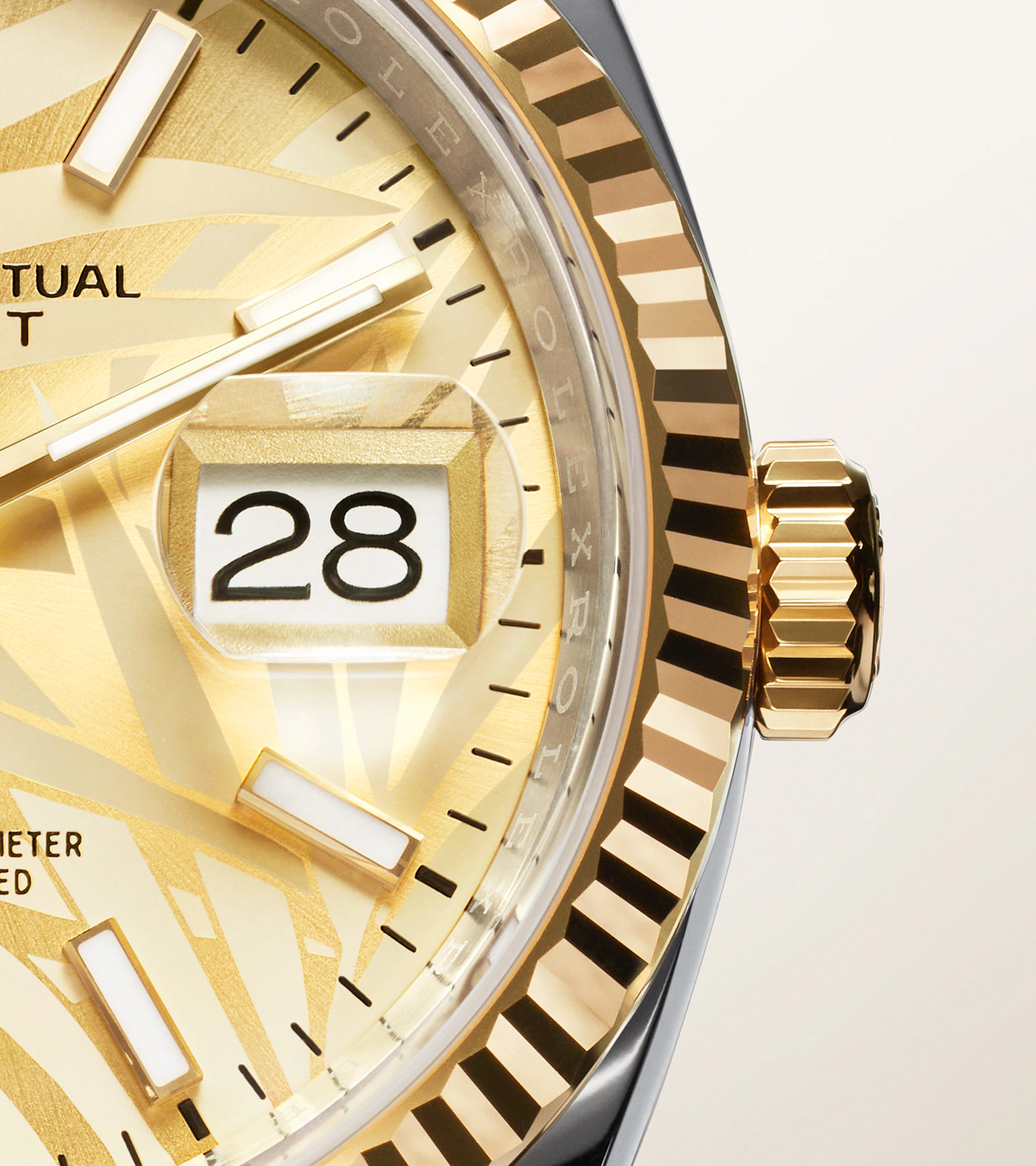 ダイアルは高い独自性と視認性を誇る、ロレックスの顔である。変色しにくいゴールド製アワーマーカーが特徴的。すべてのロレックスのダイアルは、デザインから製造まで自社内で行い、完璧を期すために大部分が手作業で行われている。