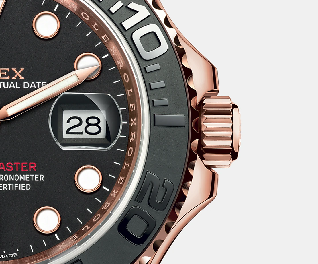 ロレックスが開発・特許を取得したヨットマスターの新しいオイスターフレックス ブレスレットは、メタル ブレスレットとは異なるスポーティーな魅力を放つ。ブレスレットは柔軟性のあるチタン・ニッケル合金製ブレードで、時計のケースとセーフティキャッチ付オイスターロッククラスプに接続されている。このブレードは環境からの影響を受けにくく、極めて耐久性に優れる高性能ブラックエラストマーで覆われ、着用者の手首にしっかりとフィットする。装着感を高めるために、オイスターフレックス ブレスレットの内部には特許を取得した縦方向クッションシステムが備わり、時計を手首で安定させる。ブレスレットには18 ct エバーローズゴールドの、セーフティキャッチ付オイスターロッククラスプが装備されている。 また、ロレックスがデザインし、特許を取得したロレックスグライドロック エクステンションシステムも搭載されています。この独創的なメカニズムは、クラスプカバーの裏のラック(刻み)により、工具を使わずにブレスレットの長さを約2.5mm単位で最大約15mm延長することができます。