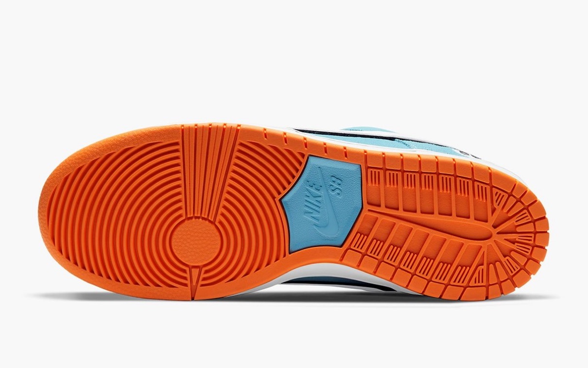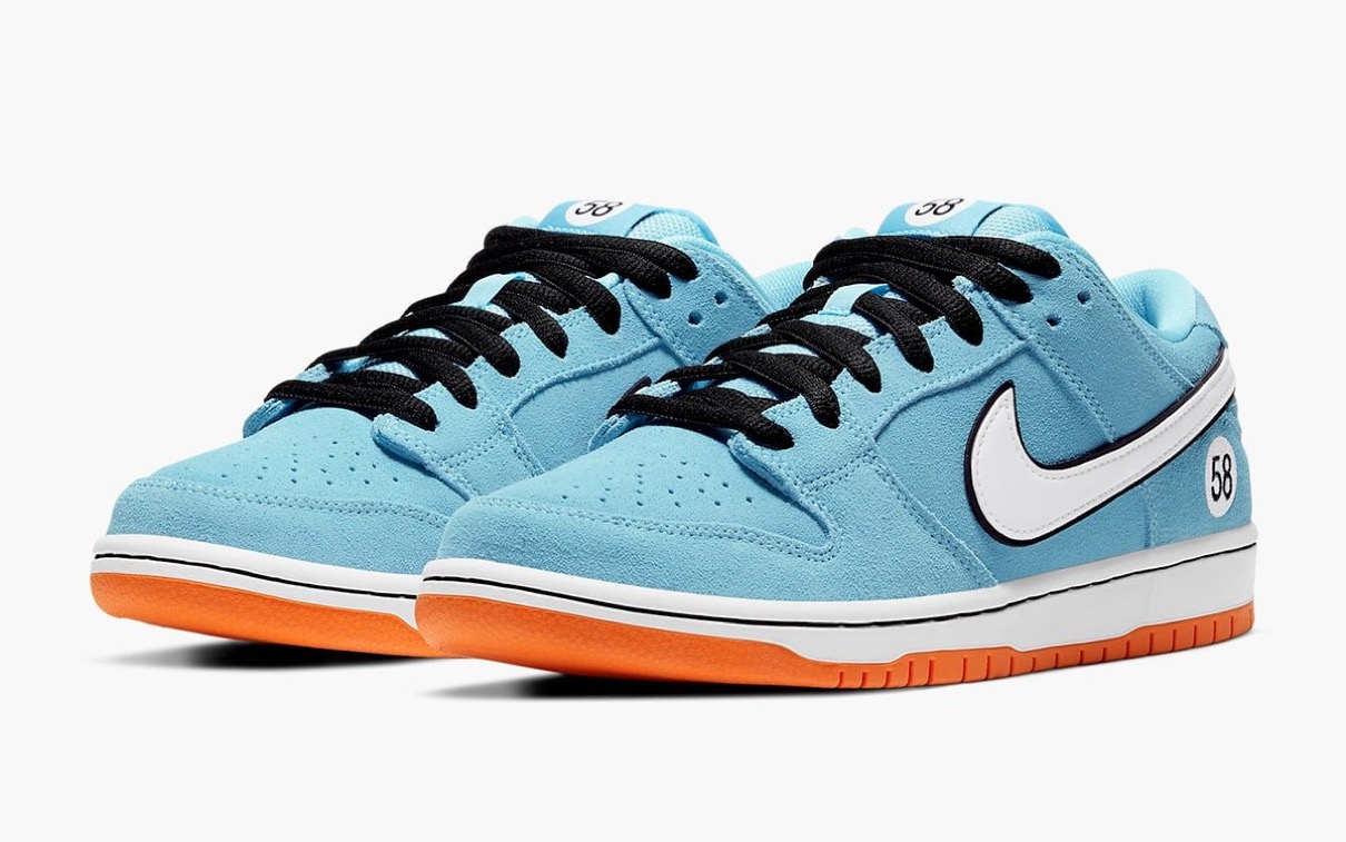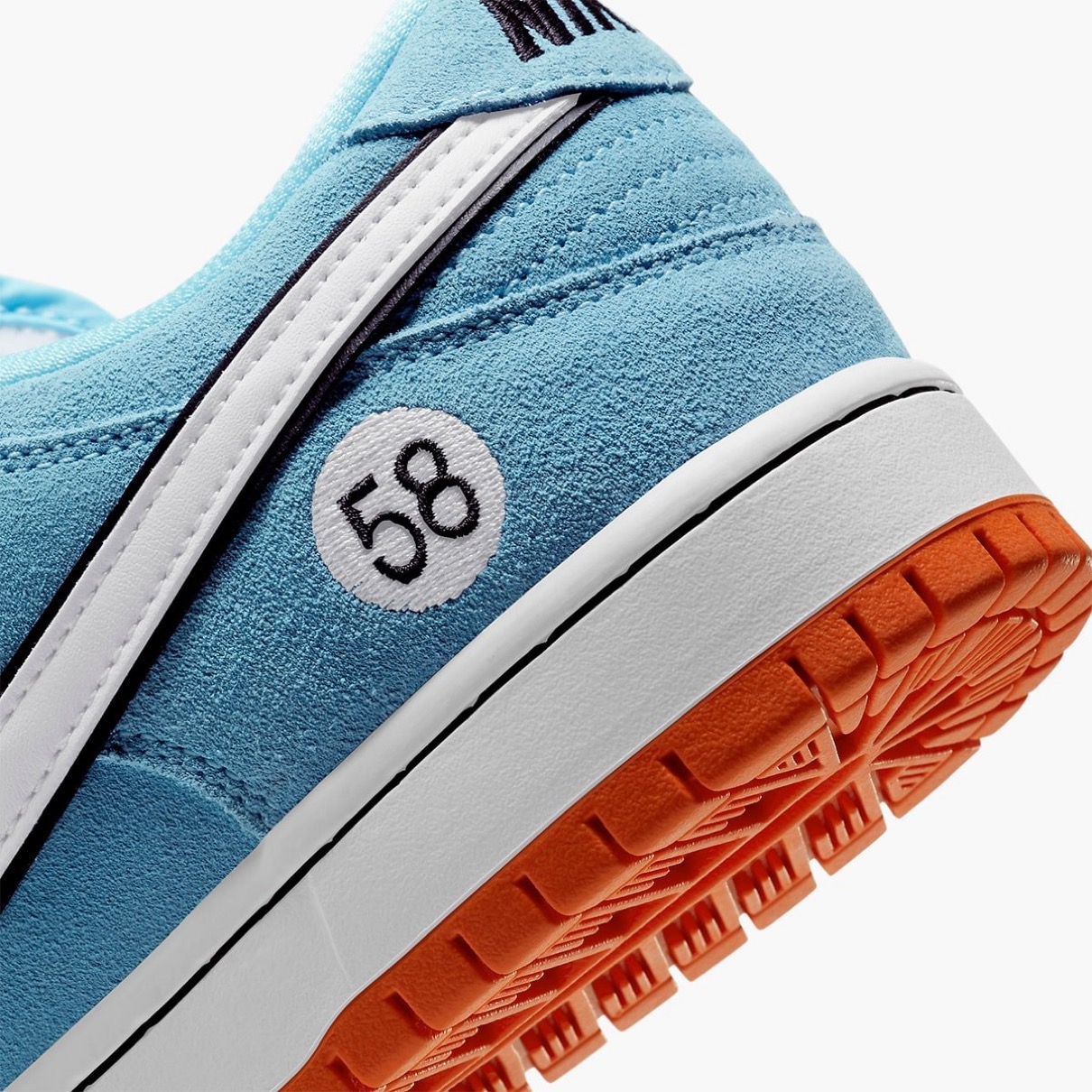 そして今回、1922年創業 アメリカの石油会社『ガルフ石油(Gulf Oil)』が後援するガルフ・レーシングのレーシングカーにインスパイアされたデザインの新作SBダンクが登場。フォード、ミラージュ、マクラーレン、アストン マーティン、ポルシェなどガルフ歴代のレーシングカーに使用されてきた象徴的なスカイブルーとオレンジカラーを基調にシューズを構築。スウェード素材で構築されたアッパーのヒールサイドおよびシュータンラベルの“ゼッケン”には、2017年に公開されたNike SBチームがアメリカ東海岸を廻ったツアービデオ『58 Tour East(58 ツアーイースト)』にインスパイアされた“58”がナンバリングされている。このナンバリングはケングリフィーJr.のDunk Mid Pro ISOなどにも使用されており、現代のSBを象徴するナンバーだ。
